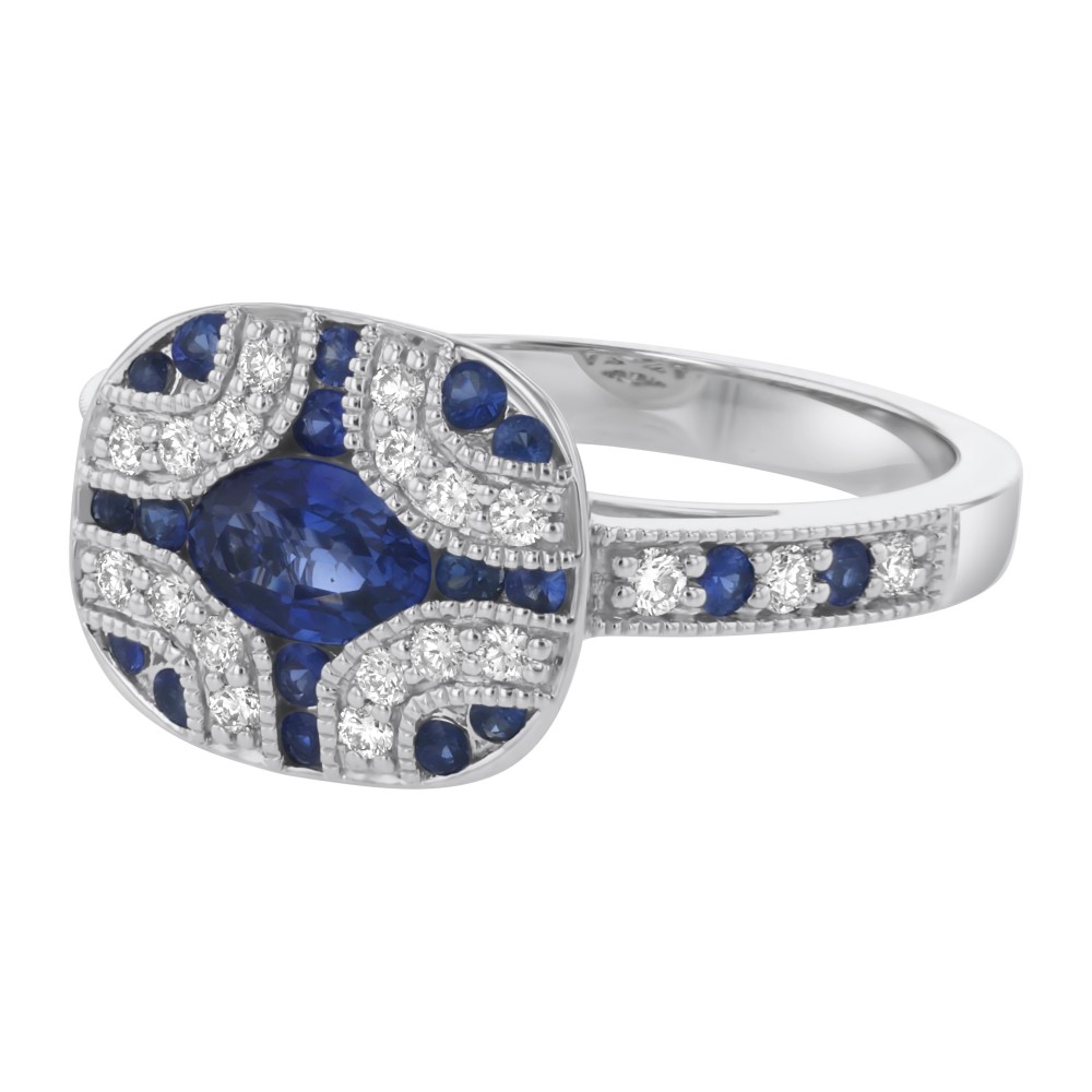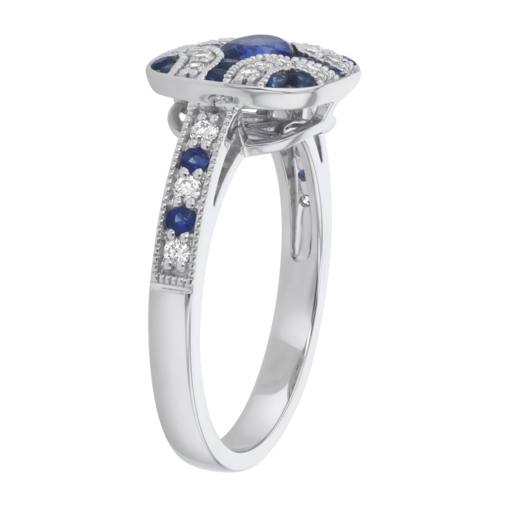 14K white gold art deco ring set with 0.25 ct. white round diamonds and 0.95 ct. blue sapphires.