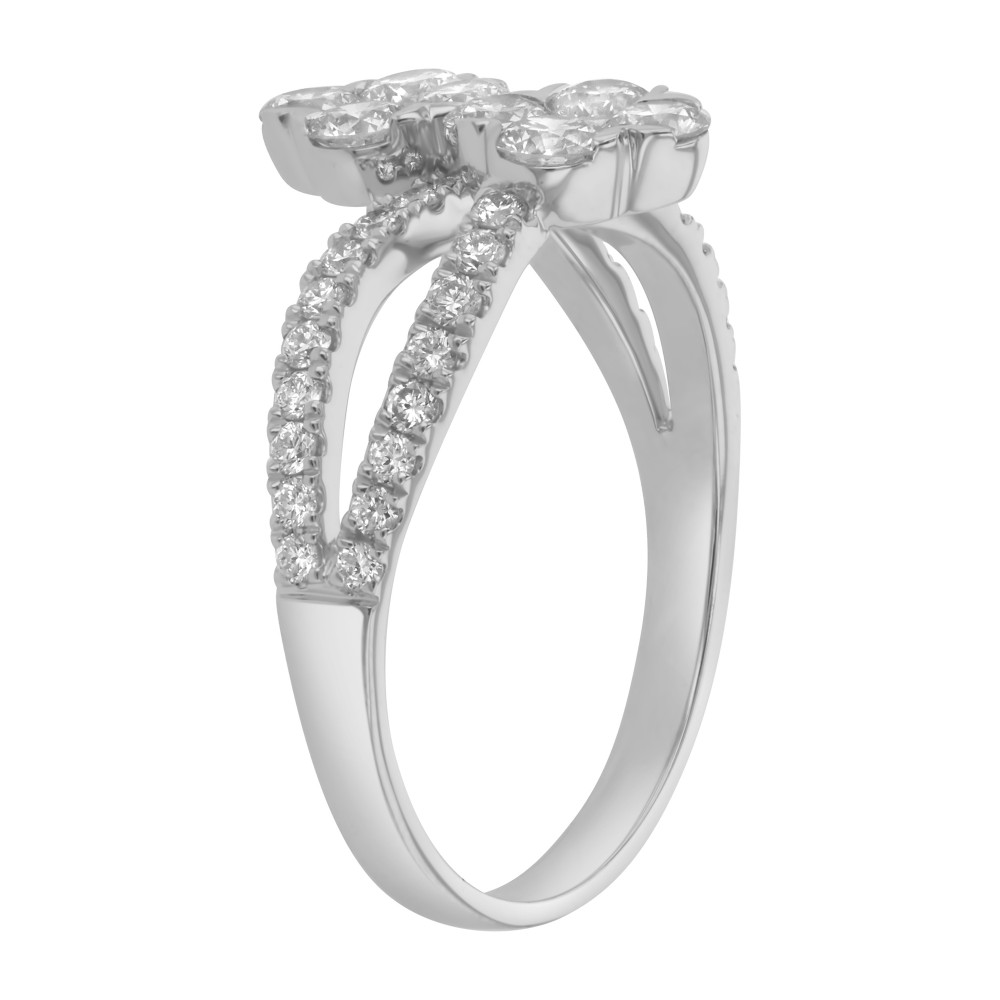 14K white gold double clover fashion ring set with 1.20 carat round brilliant diamonds and high polish finish.