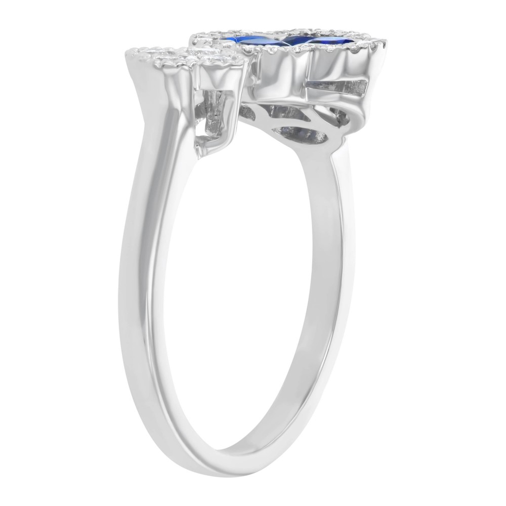 14K white gold double clovers ring set with 0.25 ct. white round diamonds and 1.00 ct. blue sapphires.