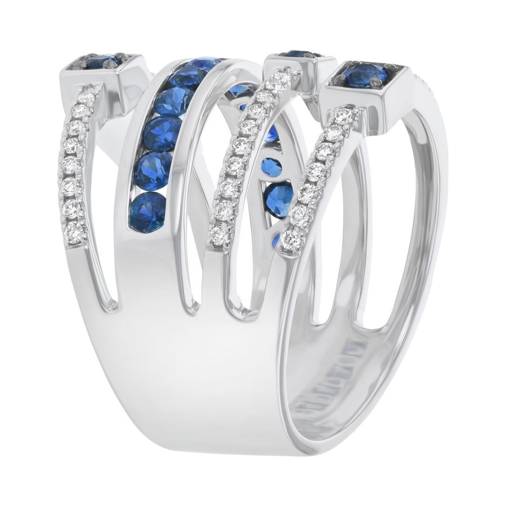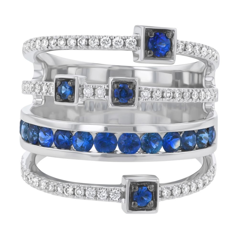 14K white gold wide multi row ring set with 0.35 carat white round diamonds and 0.90 carat blue sapphires.