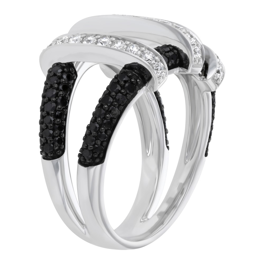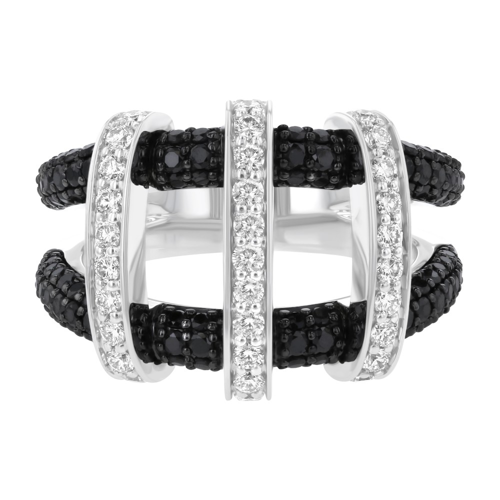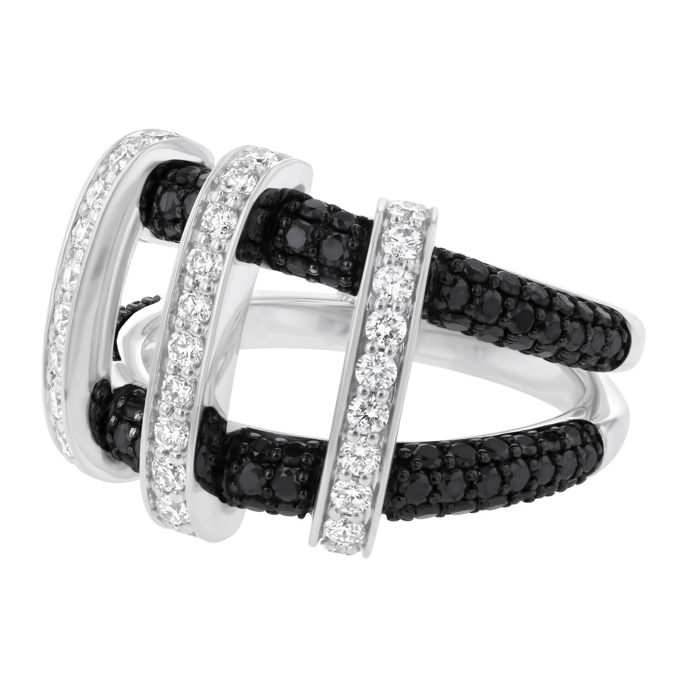 14K white gold bridges ring set with 1.40 carat black and white round brilliant diamonds and high polish finish.