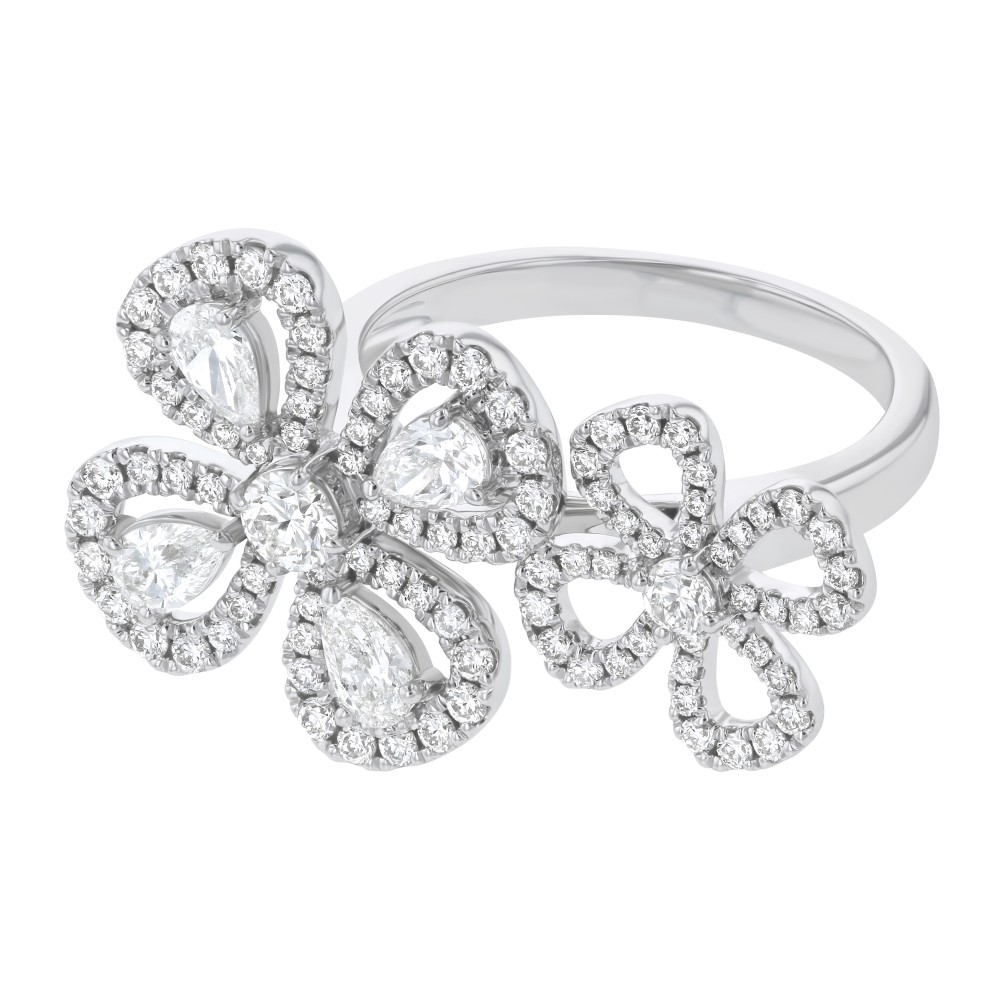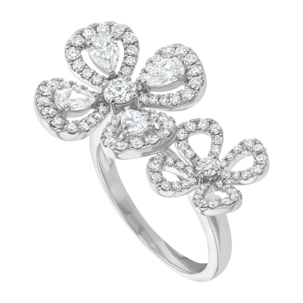 14K white gold 2 flowers ring set with 1.50 carats pear round shape brilliant diamonds and polish finish.