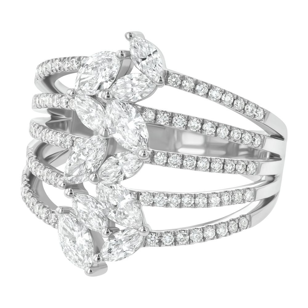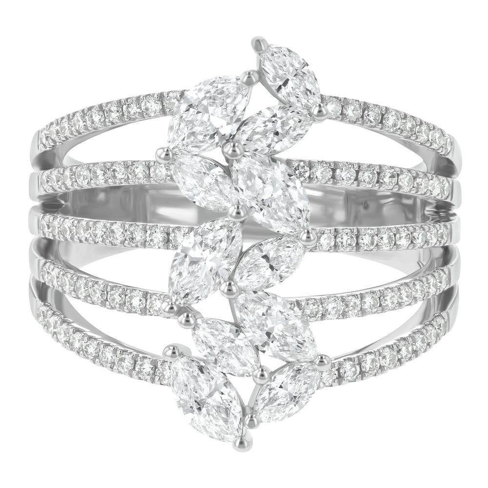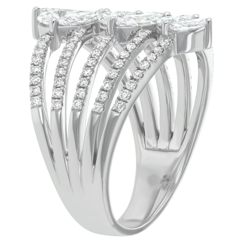 14K white gold multi row "rib cage" style ring set with 1.60 carats fancy cut marquise and round brilliant diamonds.