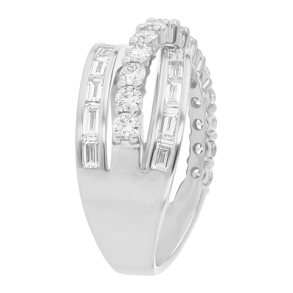 14K white gold multi row crossover fashion ring set with 1.75 carat baguette and round brilliant diamonds and high polish finish.