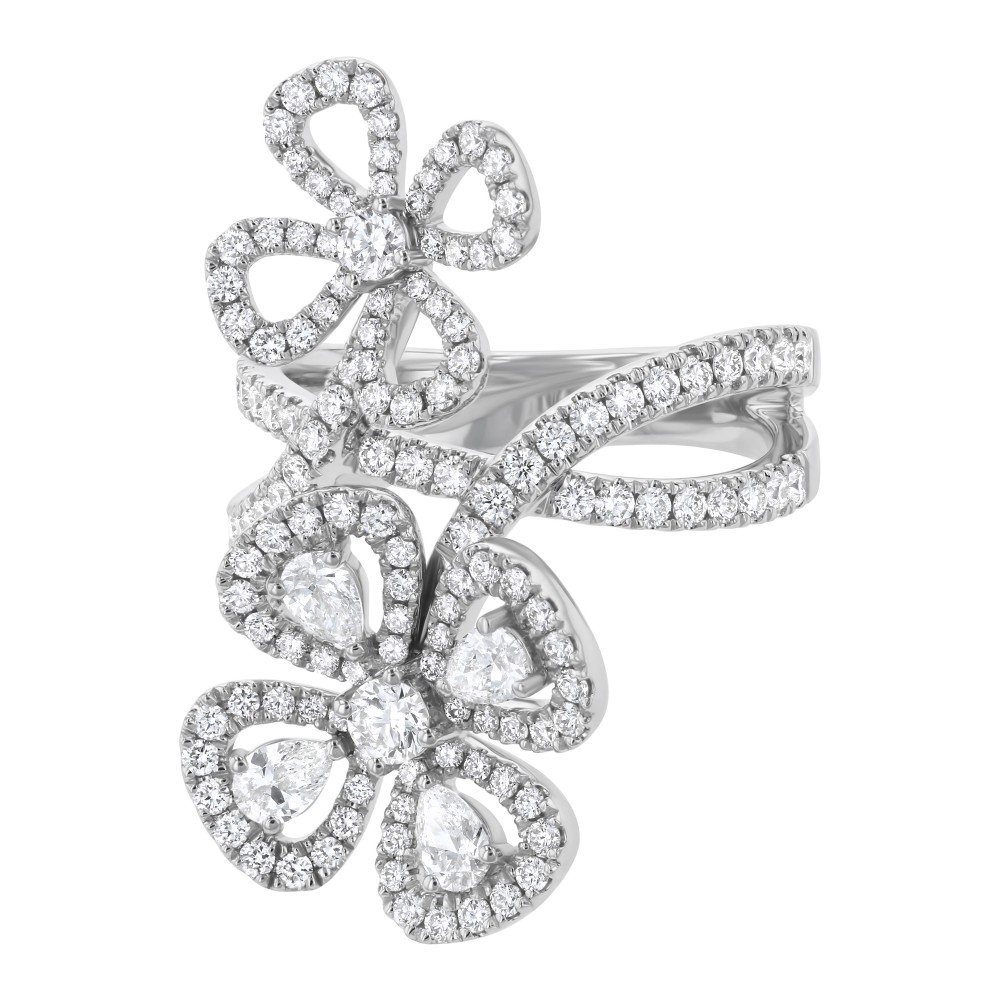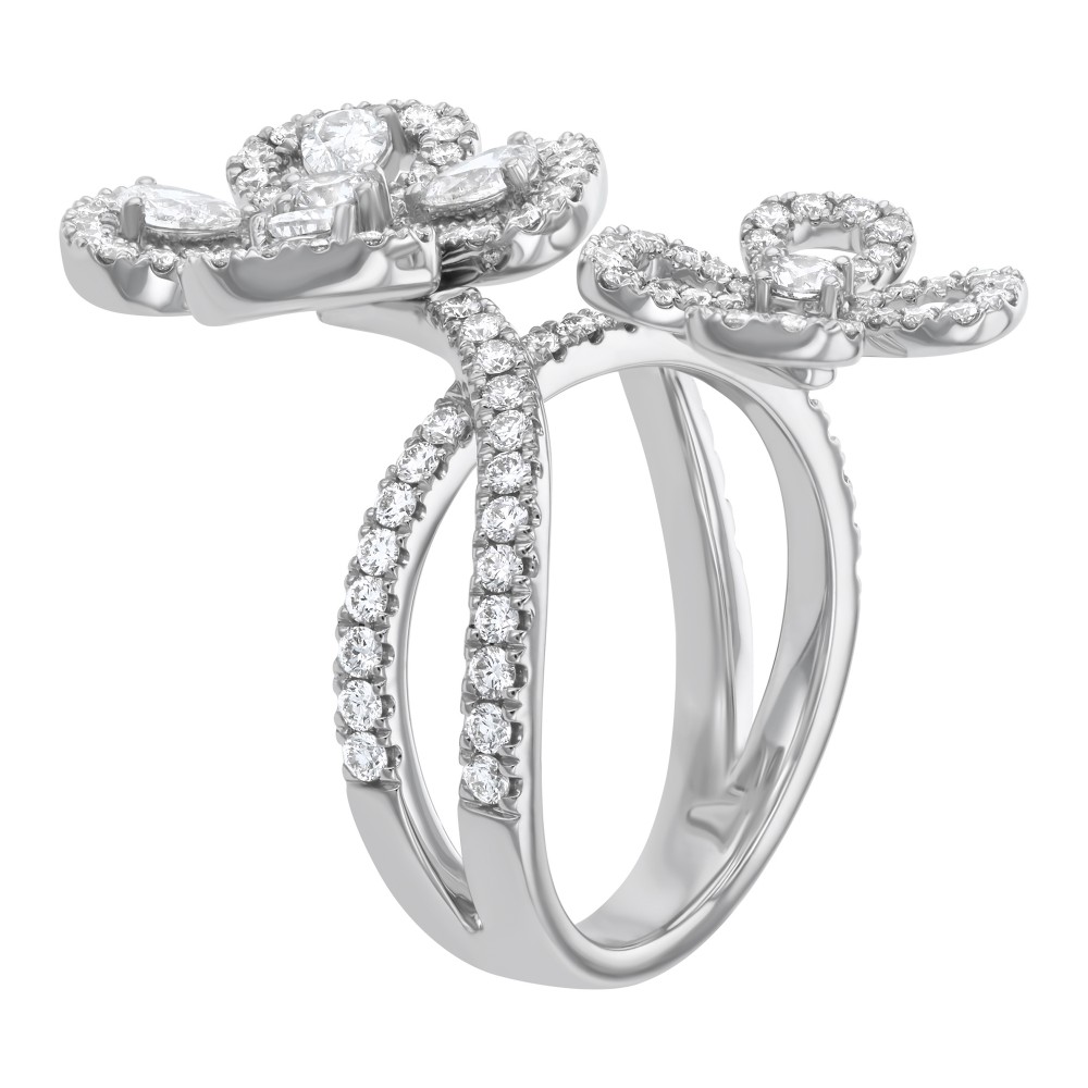 14K white gold 2 flowers ring set with 1.70 carats pear round shape brilliant diamonds and polish finish.
