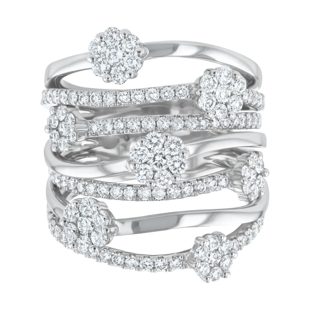 14K white gold multi row wide fashion ring set with 1.80 carat round brilliant diamonds and high polish finish.