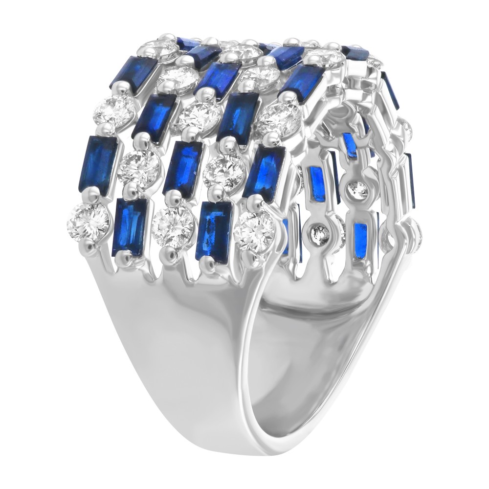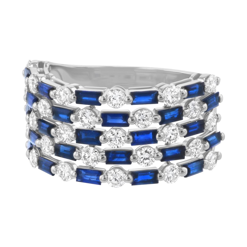 14K white gold wide multi row ring set with 1.30 ct. white round diamonds and 2.00 ct. baguette blue sapphires.