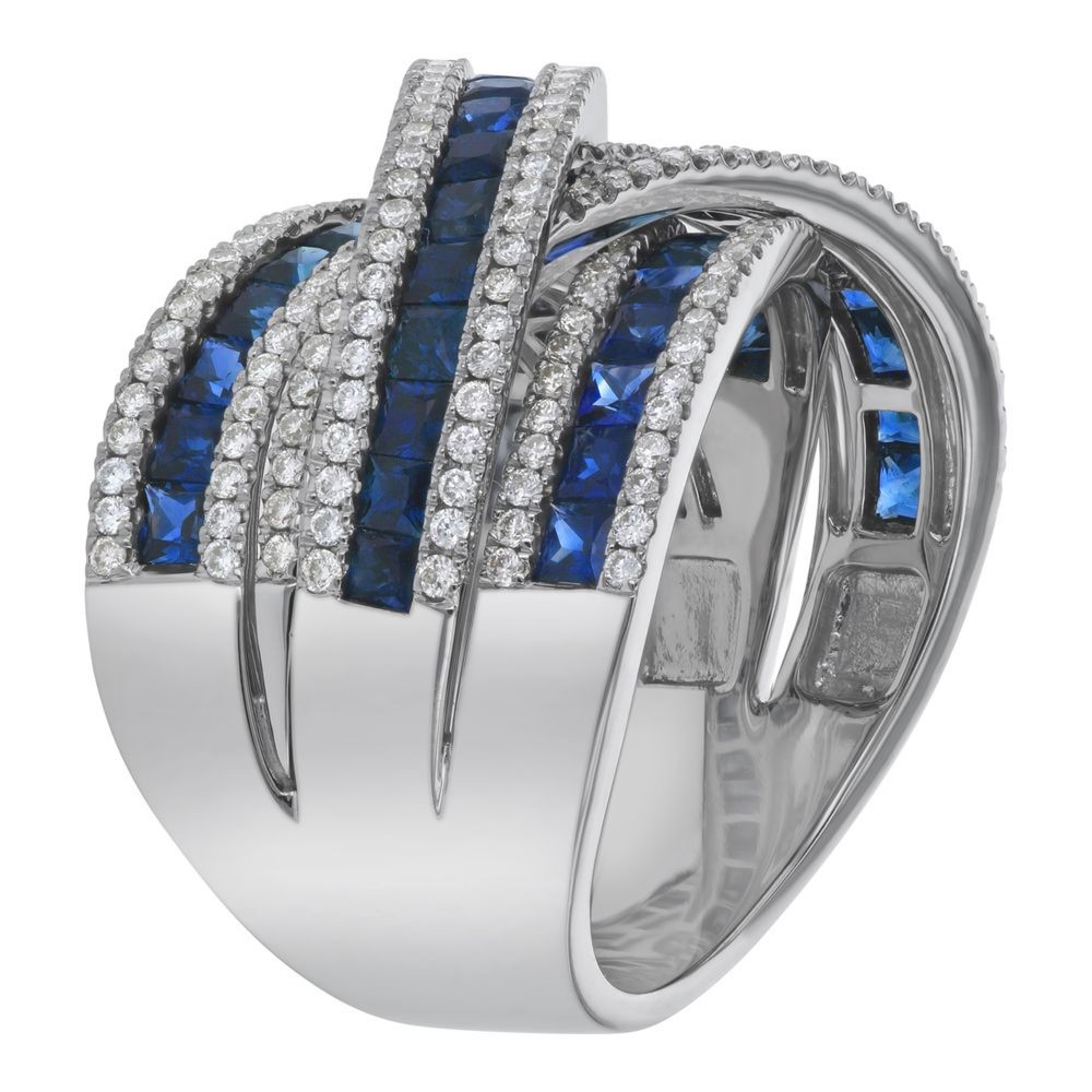 14K white gold wide ring set with 0.95 carat white round diamonds and 3.15 carat princess blue sapphires.
