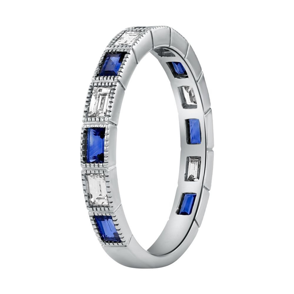 14K white gold band ring set with 0.70 ct. baguette blue sapphires and 0.47 ct. baguette brilliant diamonds.