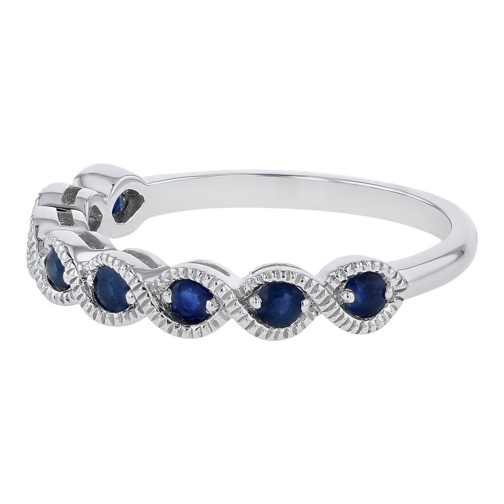 14K white gold band ring set with 0.40 ct. round blue sapphires.