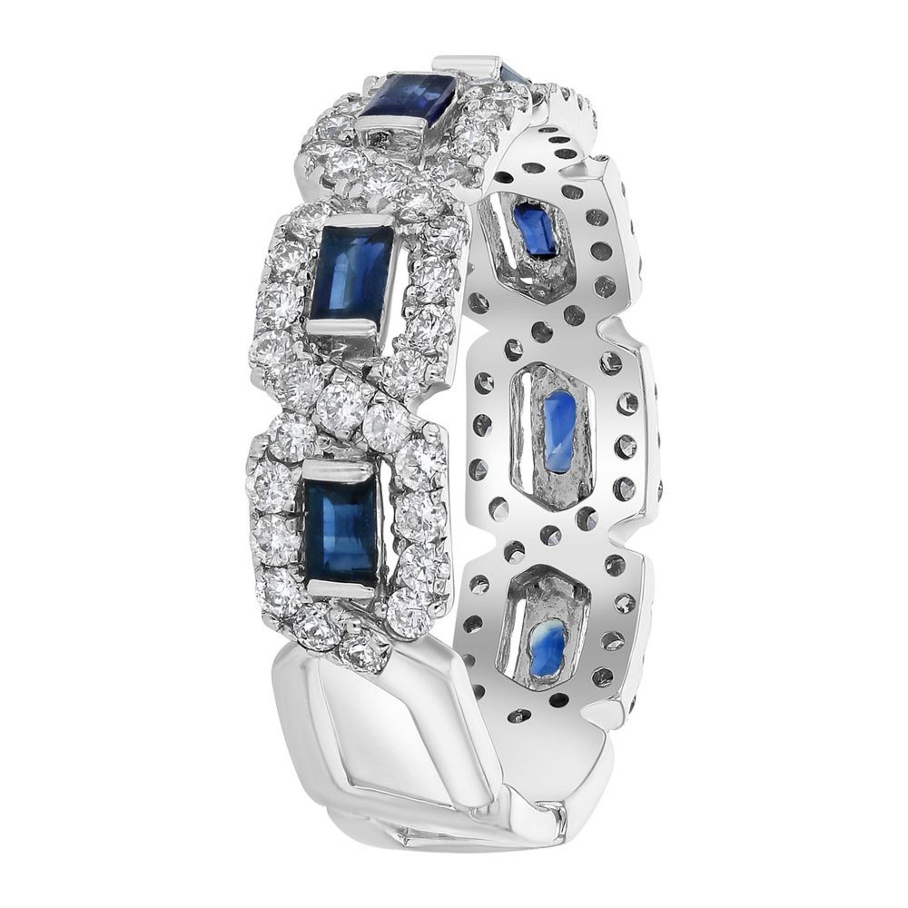 14K white gold band ring set with 0.60 ct. round blue sapphires and 0.70 ct. round brilliant diamonds.