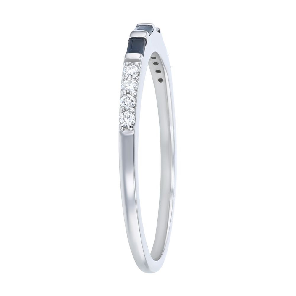 14K white gold band ring set with 0.10 ct. baguette blue sapphires and 0.08 ct. round brilliant diamonds.