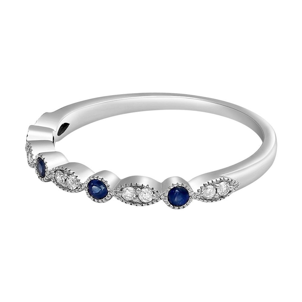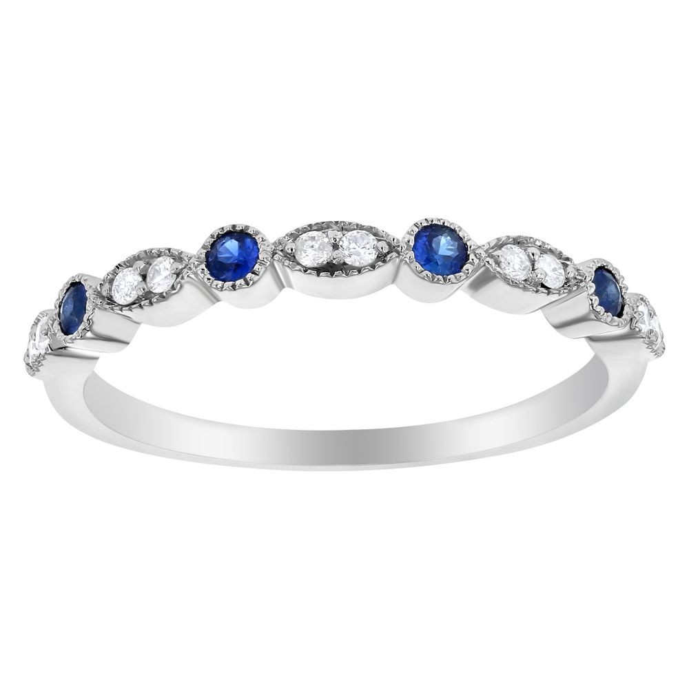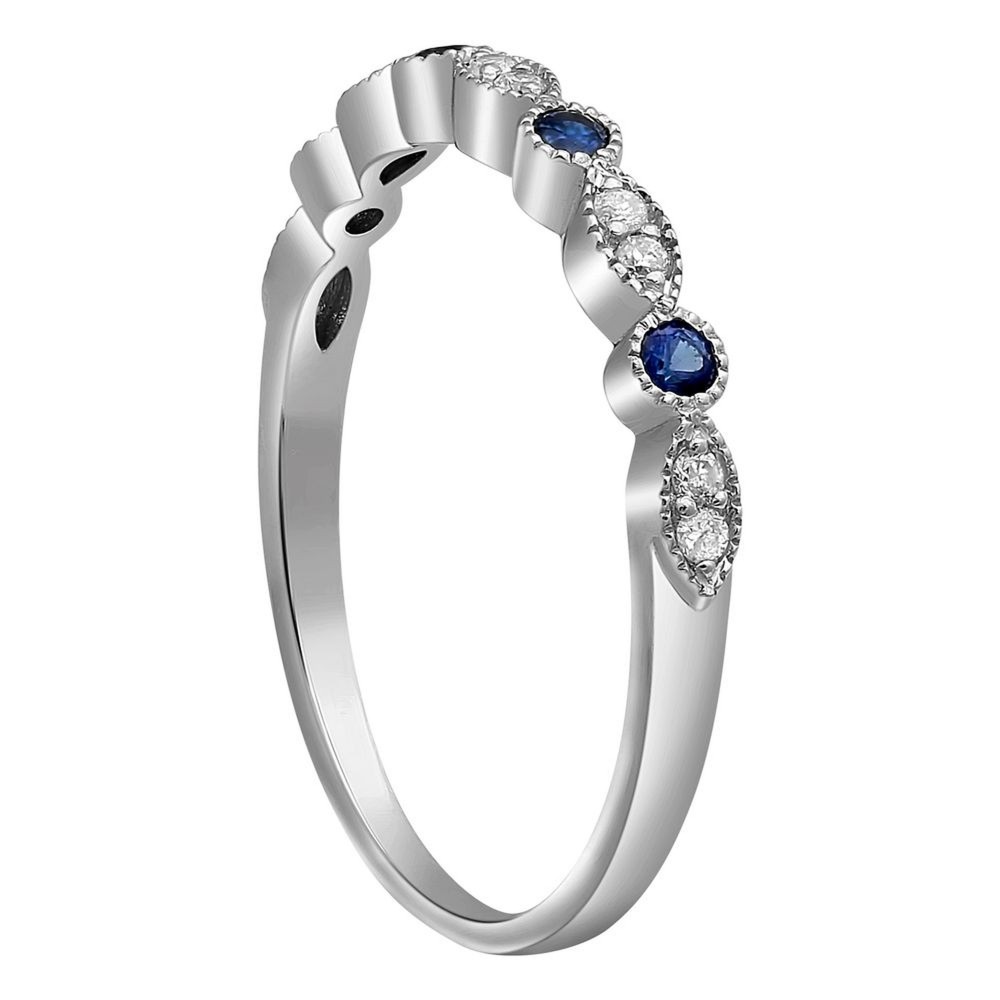 14K white gold band ring set with 0.10 ct. round blue sapphires and 0.08 ct. round brilliant diamonds.