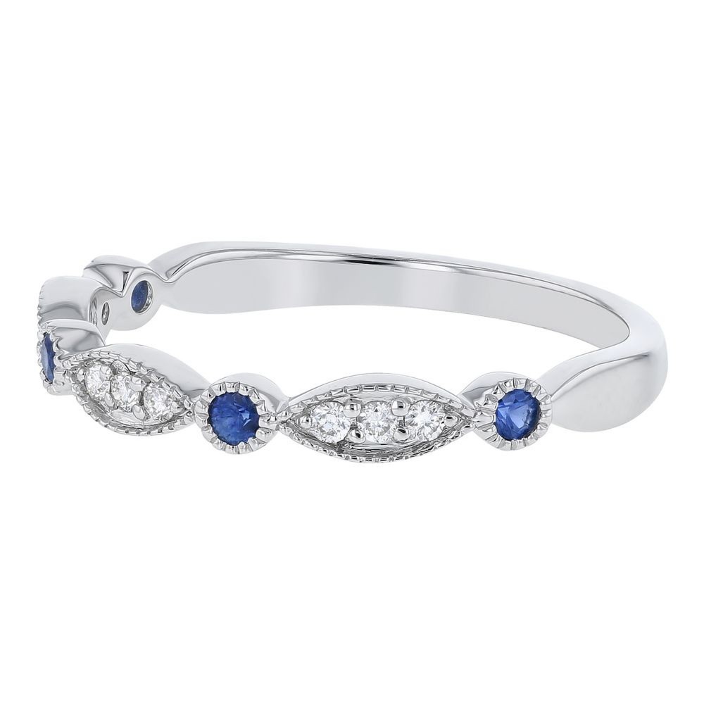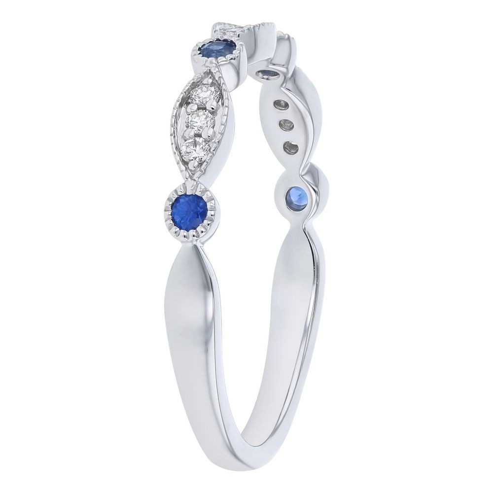 14K white gold band ring set with 0.10 ct. round blue sapphires and 0.09 ct. round brilliant diamonds.