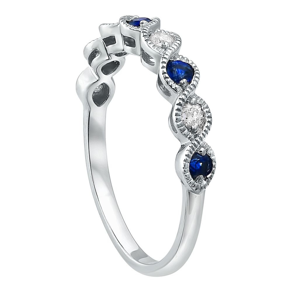 14K white gold band ring set with 0.30 ct. round blue sapphires and 0.14 ct. round brilliant diamonds.