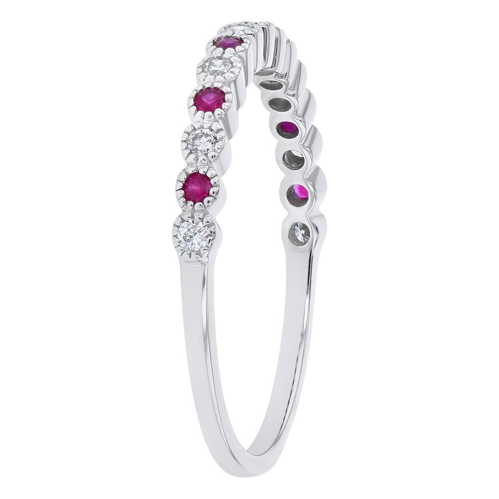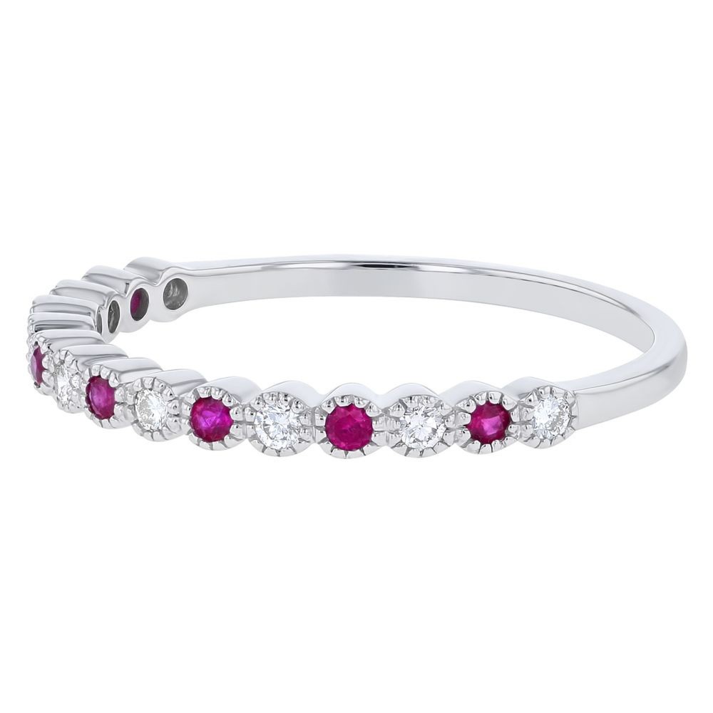 14K white gold band ring set with 0.12 ct. round rubies and 0.13 ct. round brilliant diamonds.