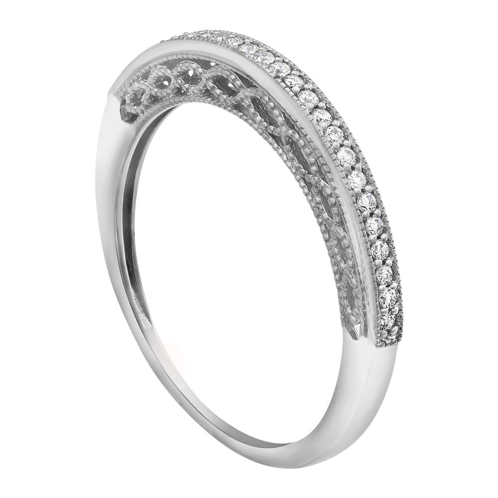 14K white gold semi-eternity vintage inspired band ring set with 0.12 ct. round diamonds.