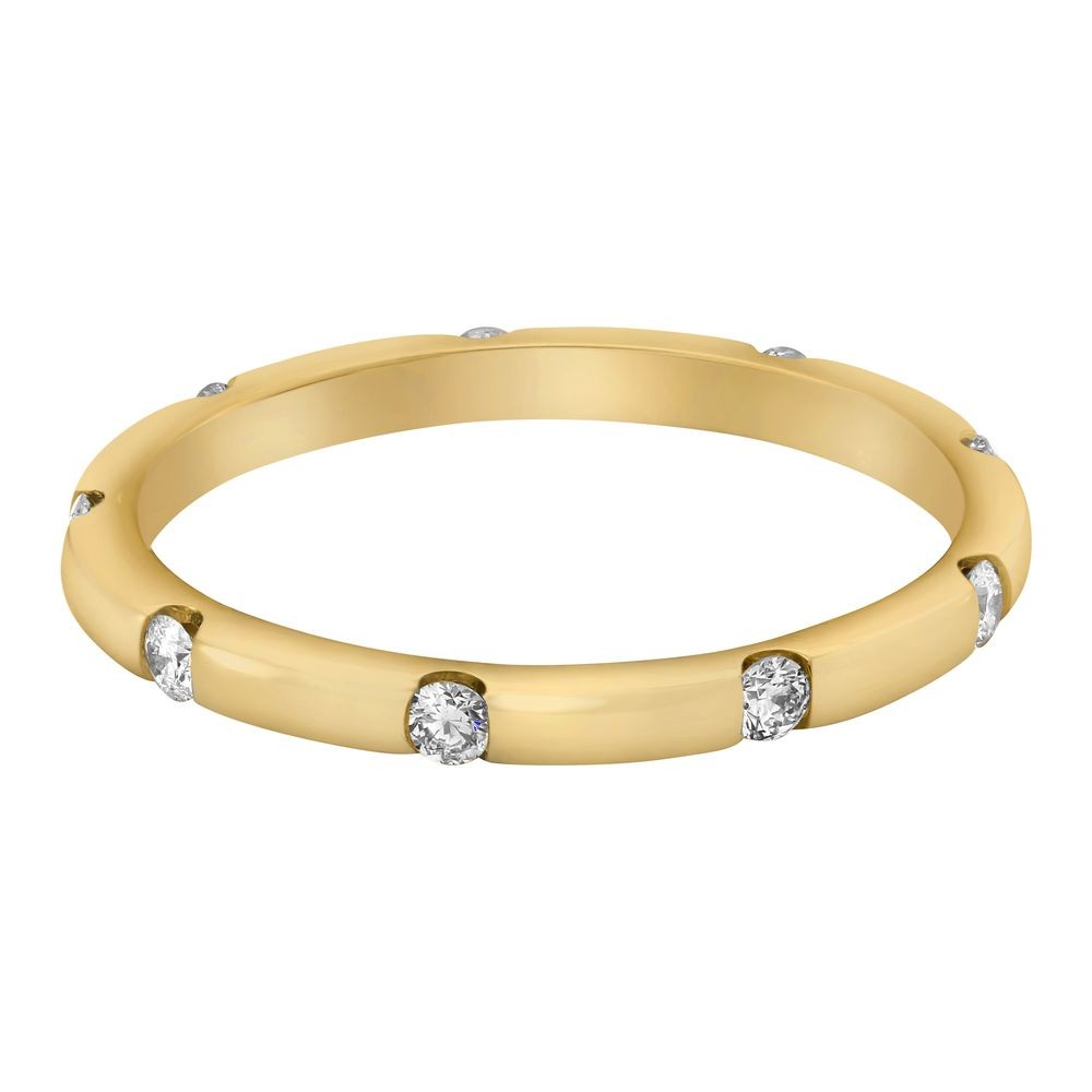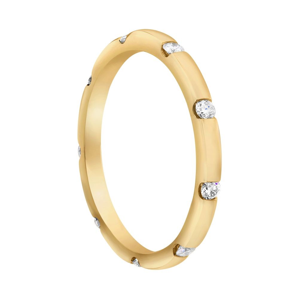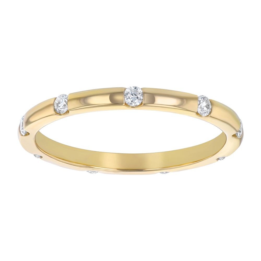 14K yellow gold eternity band ring with 0.25 ct. round diamonds. The diamonds are tension set all around the ring perimeter.