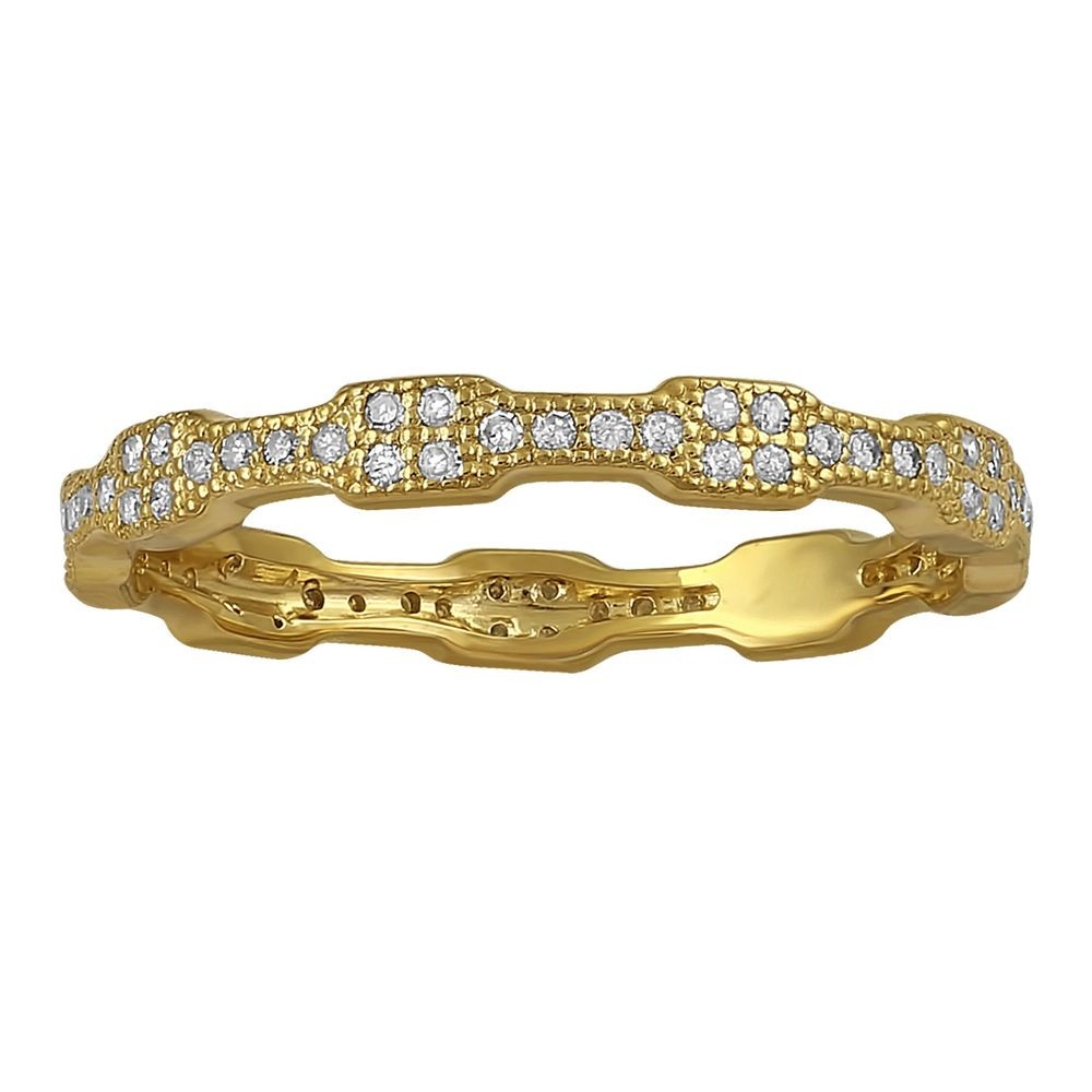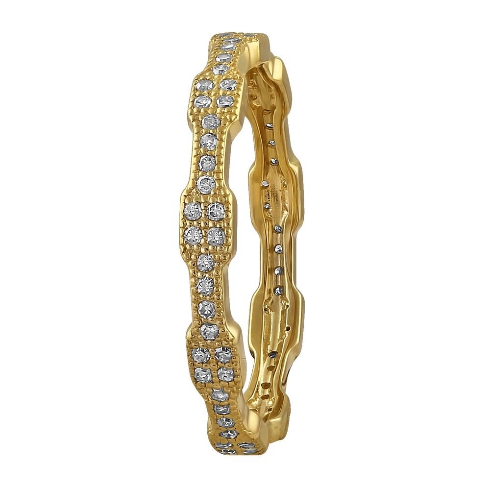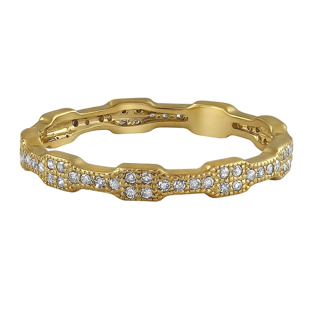 14K yellow gold eternity band ring set with 0.25 ct. round diamonds. The ring has a distinctive design that enable it to stack easy with each other. The diamonds are bead set all around the ring perimeter.