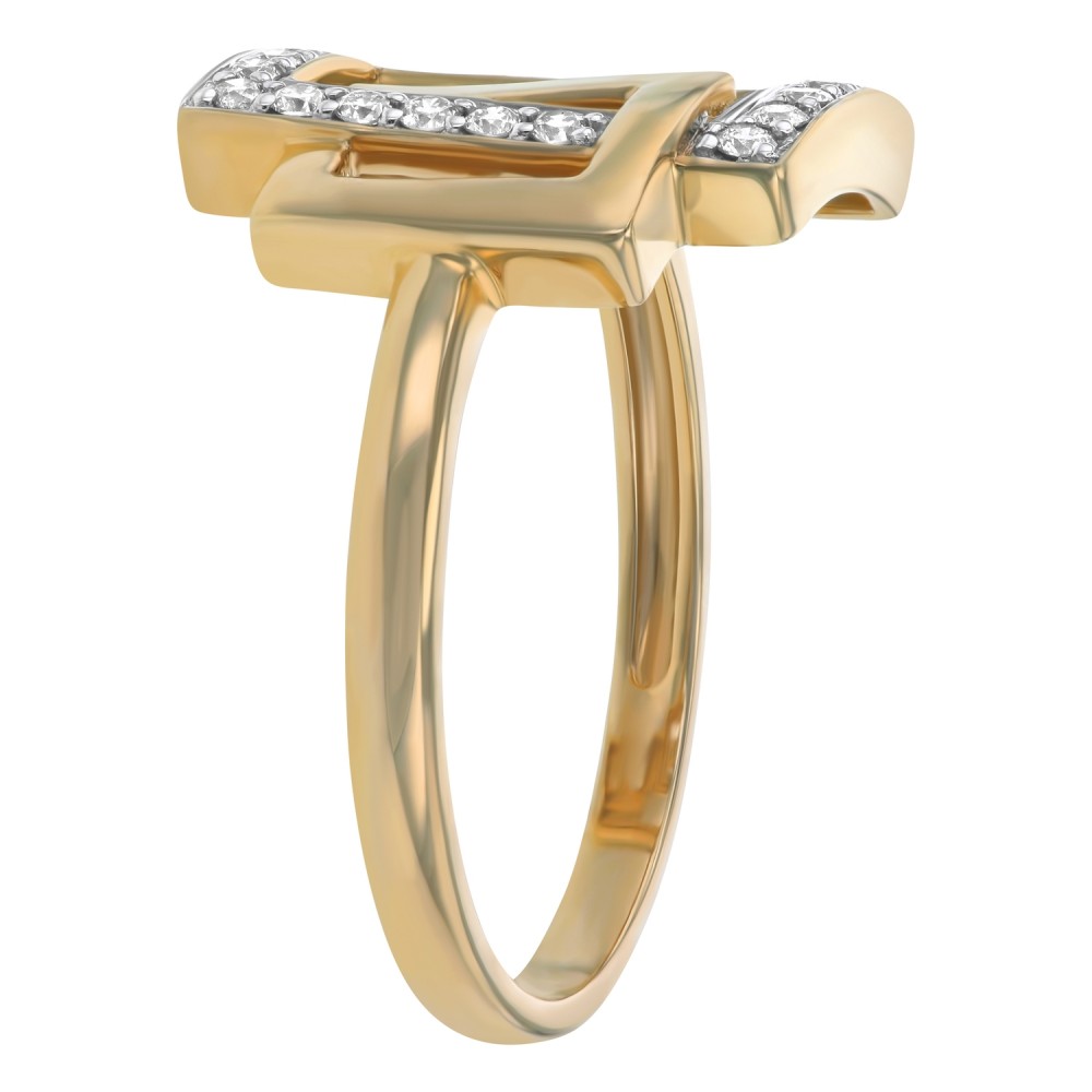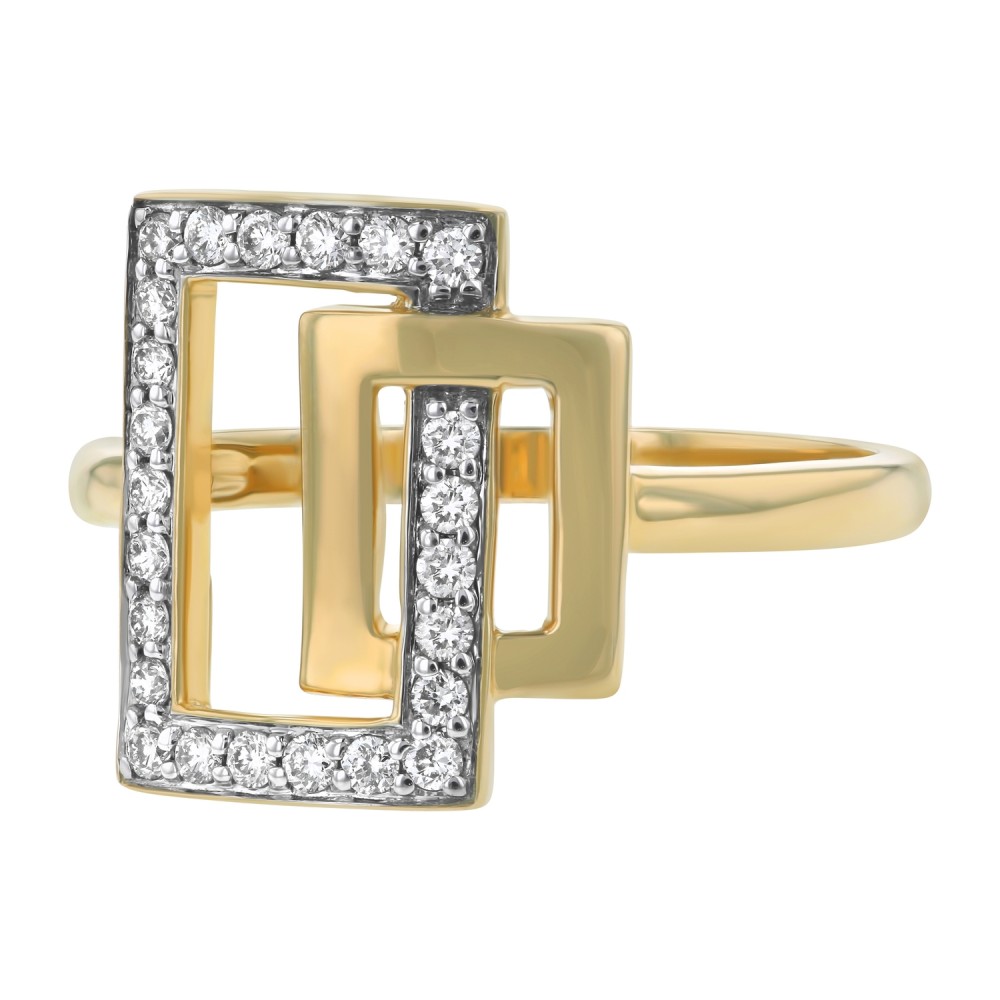 14K yellow gold geometric ring set with 0.25 carat round brilliant diamonds in two entwined rectangles design.
