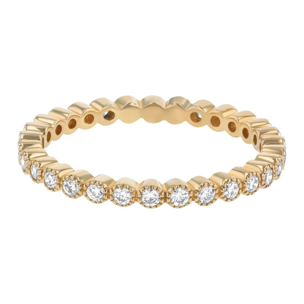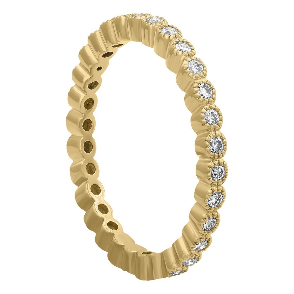 14K yellow gold eternity band ring set with 0.50 ct. round diamonds. The ring milgrain detailing showcase vintage inspired distinctive design. The diamonds are bezel set all around the ring perimeter.