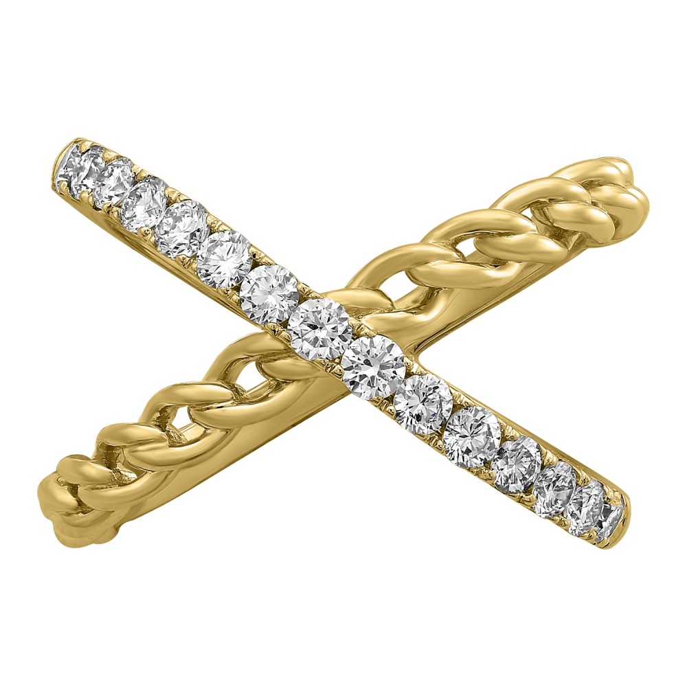14K yellow gold chain link X style fashion ring set with 0.55 carat round brilliant diamonds and high polish finish.