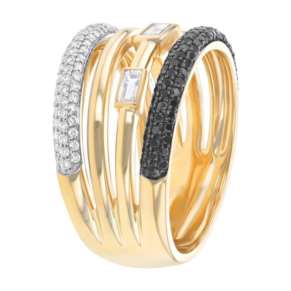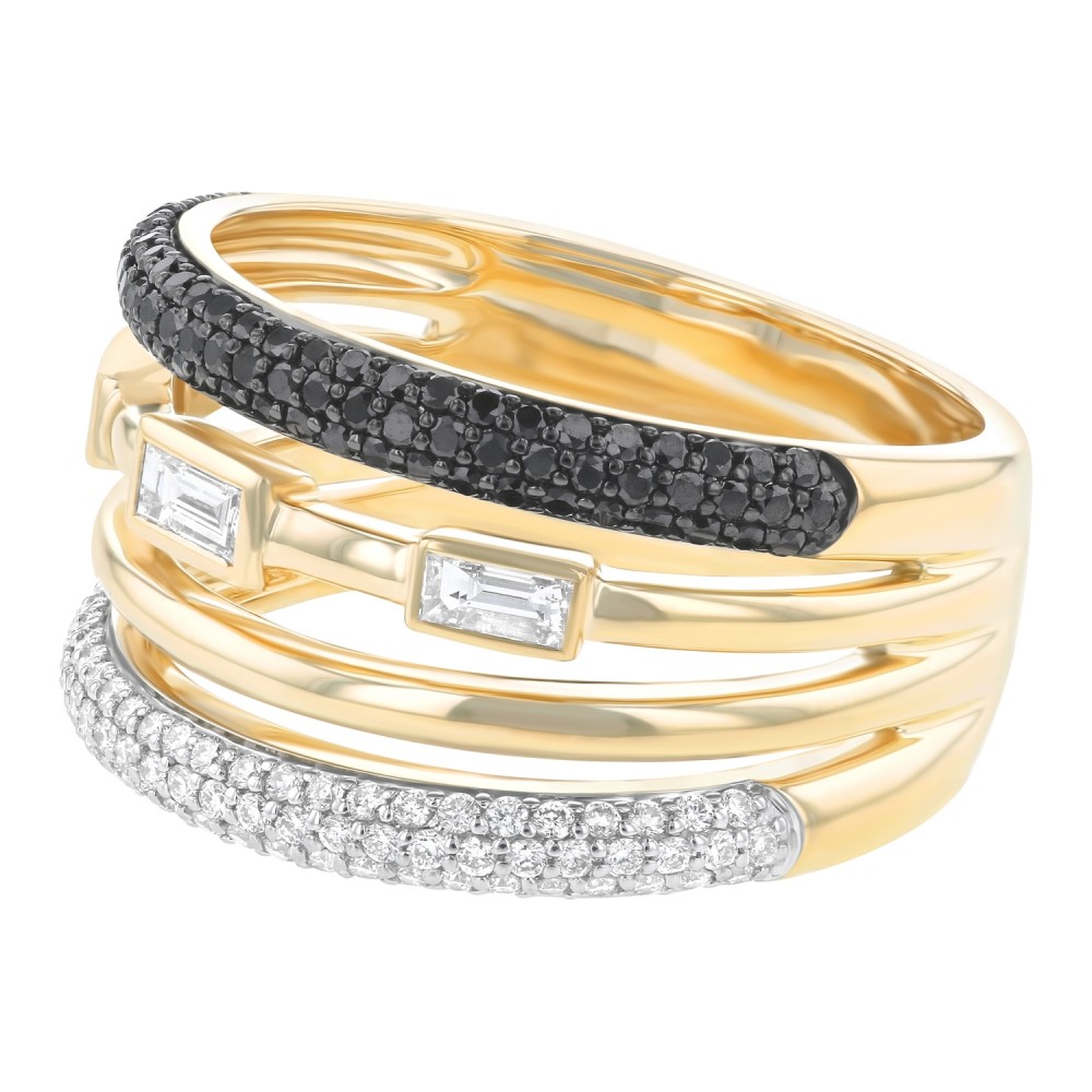 14K yellow gold multi row fashion ring set with 0.95 carat baguette and black and white round brilliant diamonds in high polish finish.