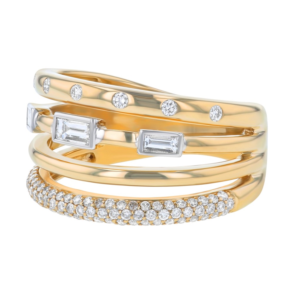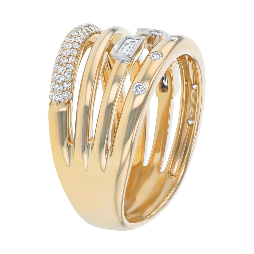 14K yellow gold multi row fashion ring set with 0.65 carat baguette and round brilliant diamonds and high polish finish.