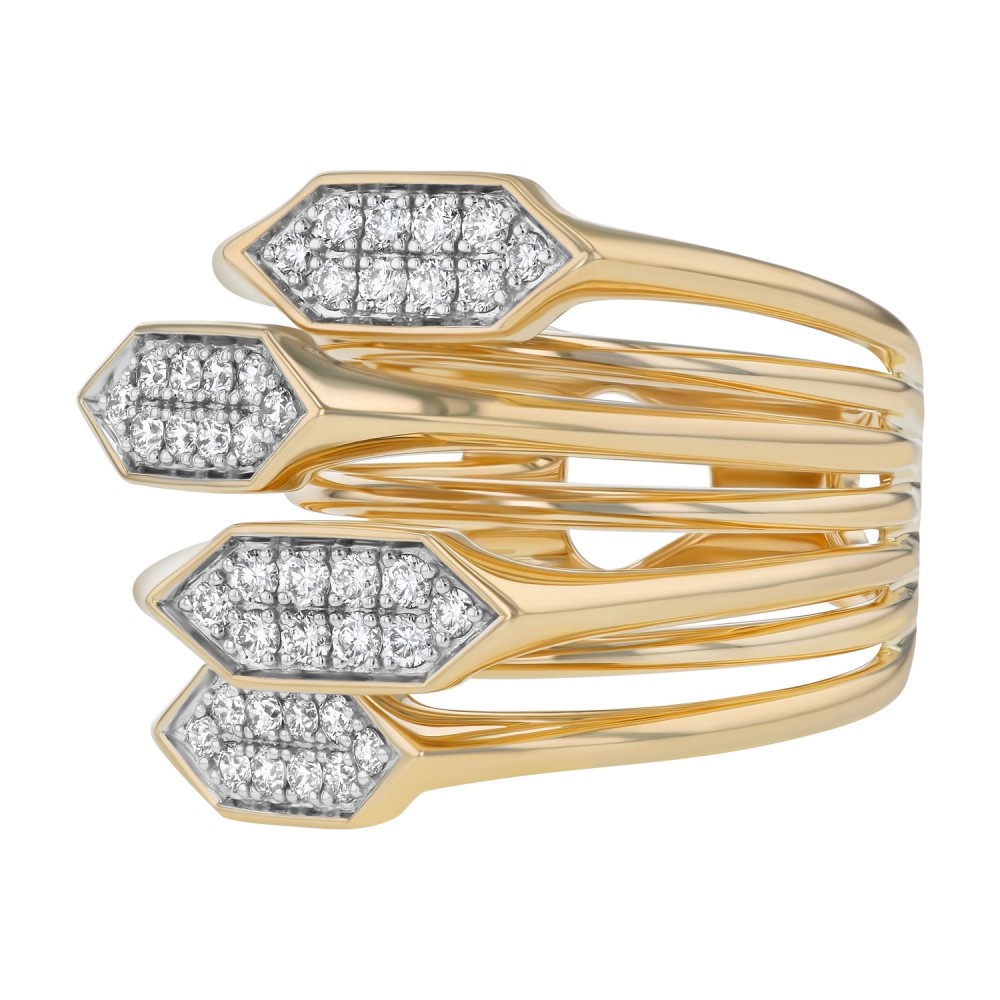 14K yellow gold wide ring with pave geometric shapes and set with 0.70 carat round brilliant diamonds and polish finish.