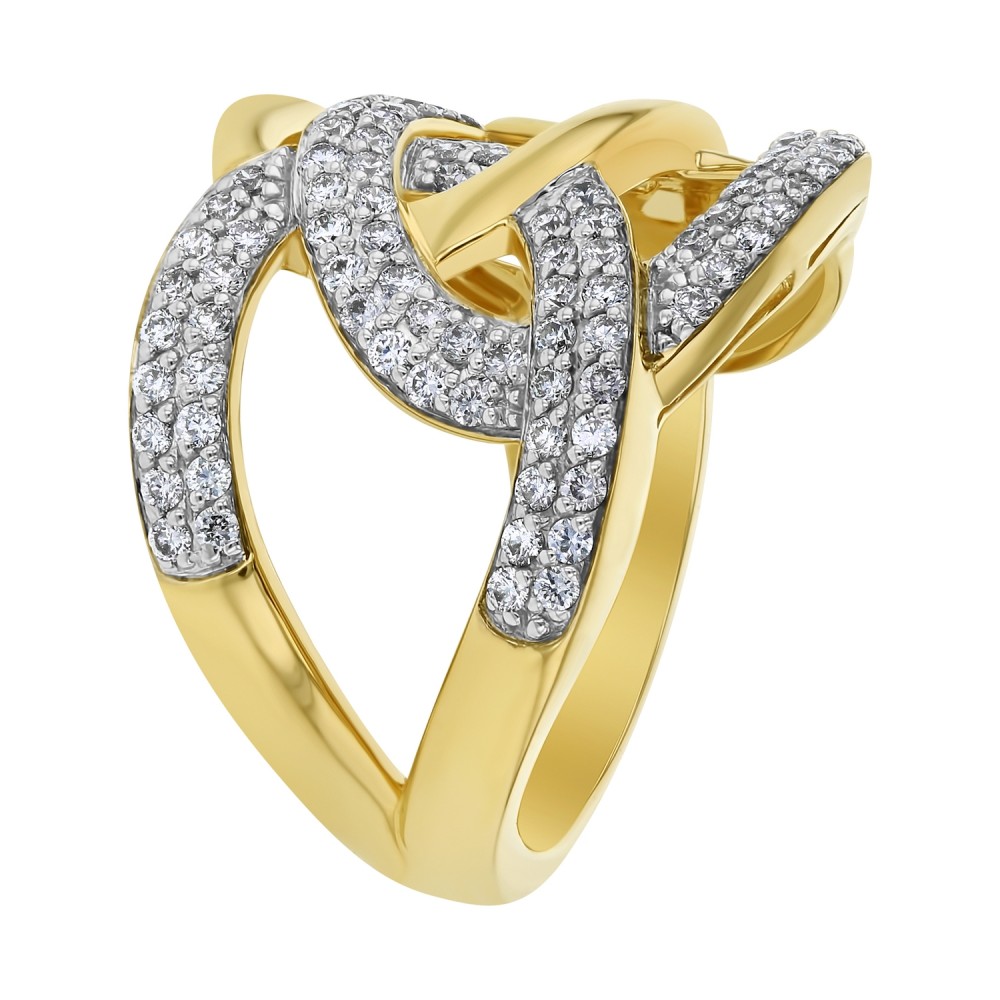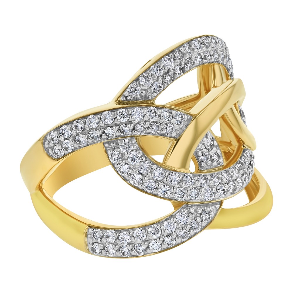 14K yellow gold entwined ovals geometric ring set with 0.75 carat round brilliant diamonds and high polish finish.