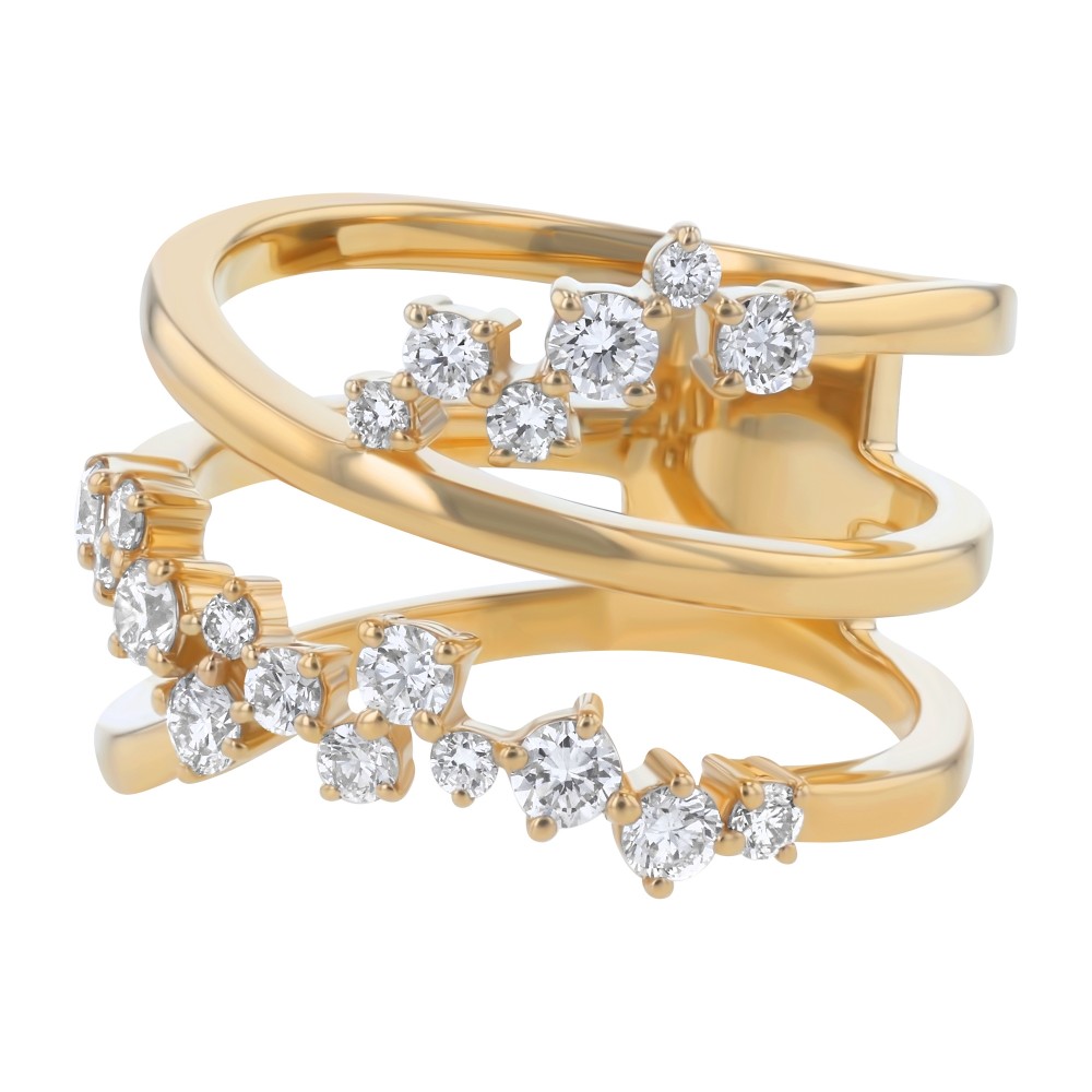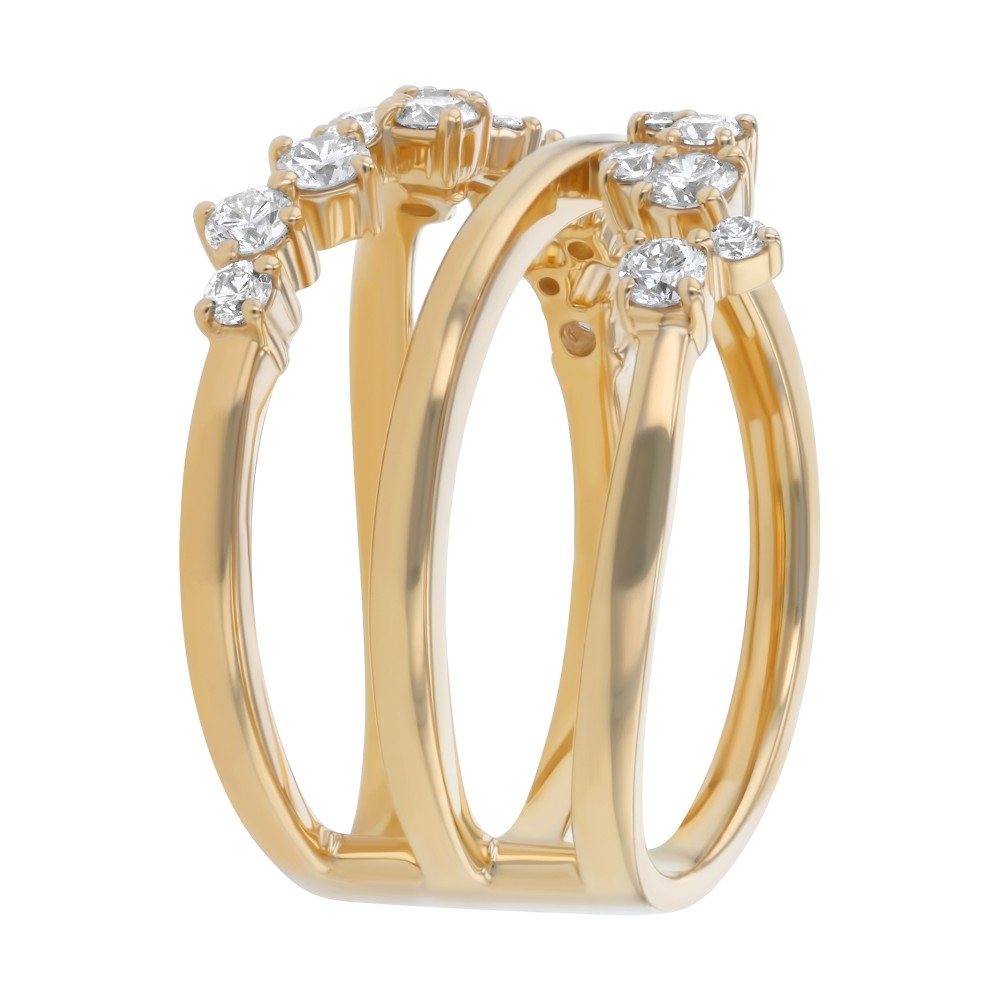 14K yellow gold spiral ring prong set with 0.75 carat round brilliant diamonds and high polish finish.