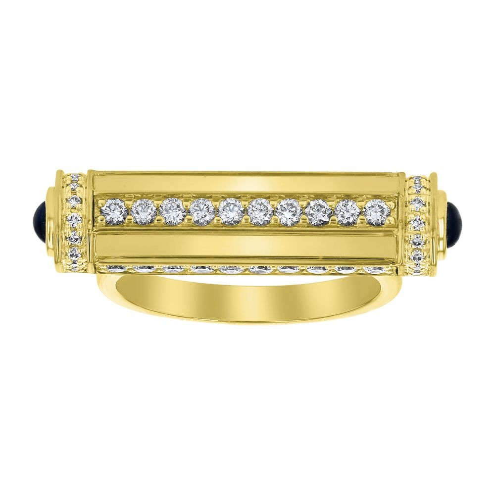 14K yellow gold mezuza ring set with 0.75 carat round white diamonds and capped with 2 cabochon blue sapphires.