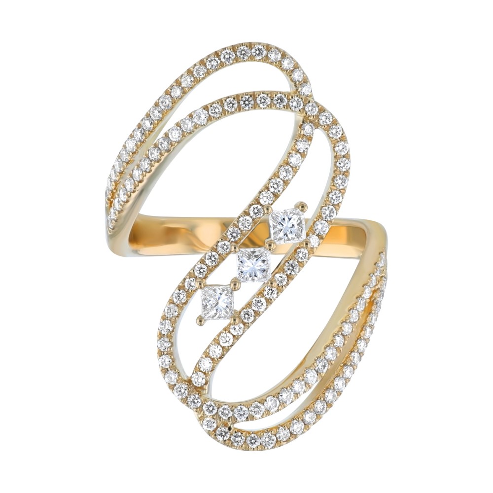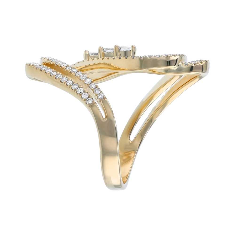 14K yellow gold free form ring set with 0.80 carat round brilliant diamonds and high polish finish.
