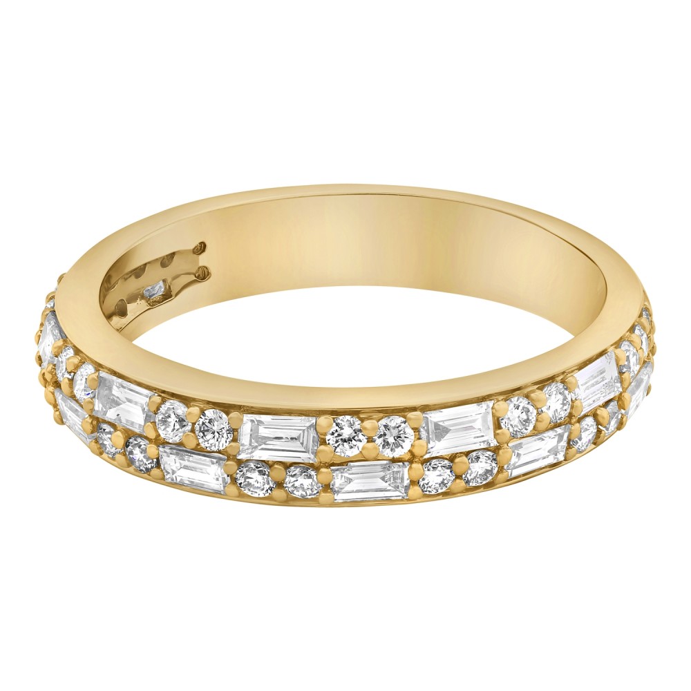 14K yellow gold semi eternity band ring set with 0.85 ct. baguette and round brilliant white diamonds and high polish finish.