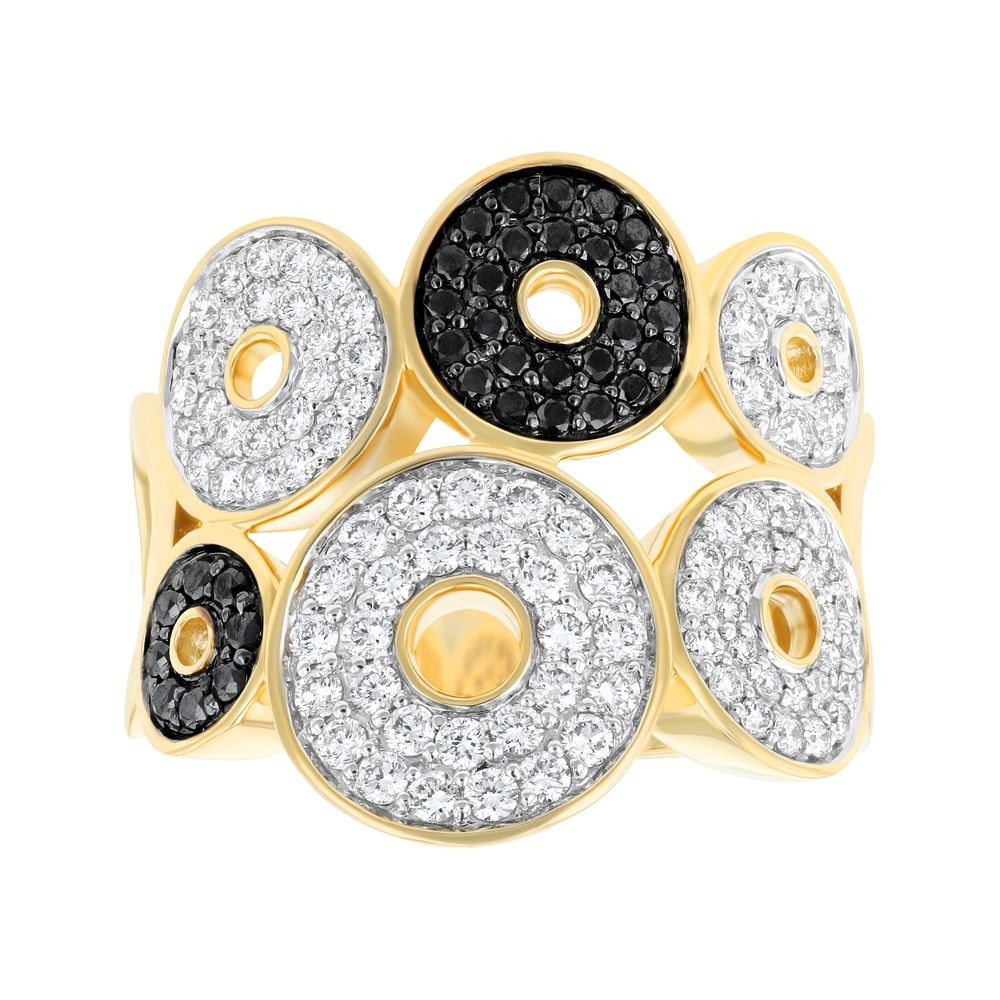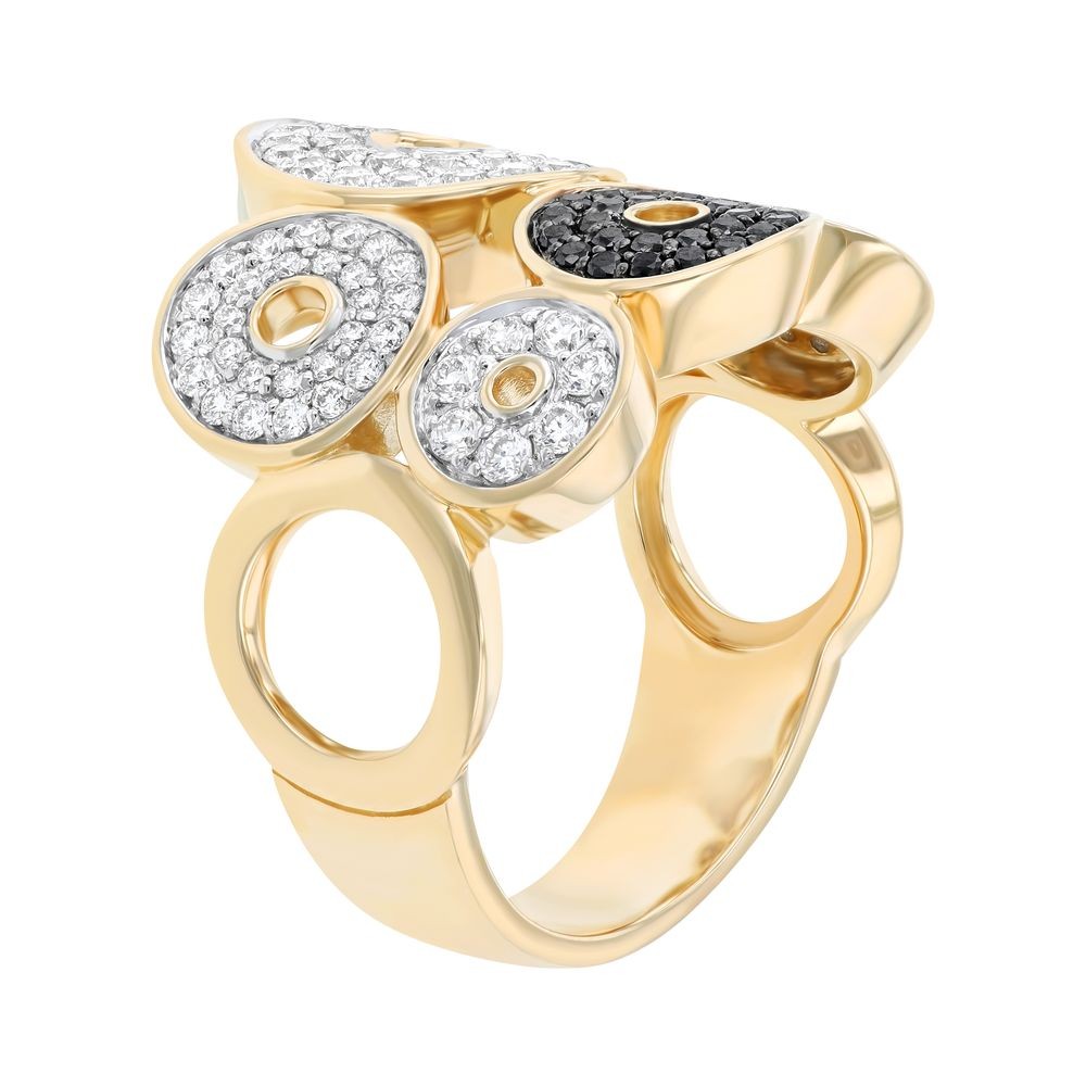 14K yellow gold geometric ring set with 0.8 carat white and 0.2 carat black round brilliant diamonds in circles design.