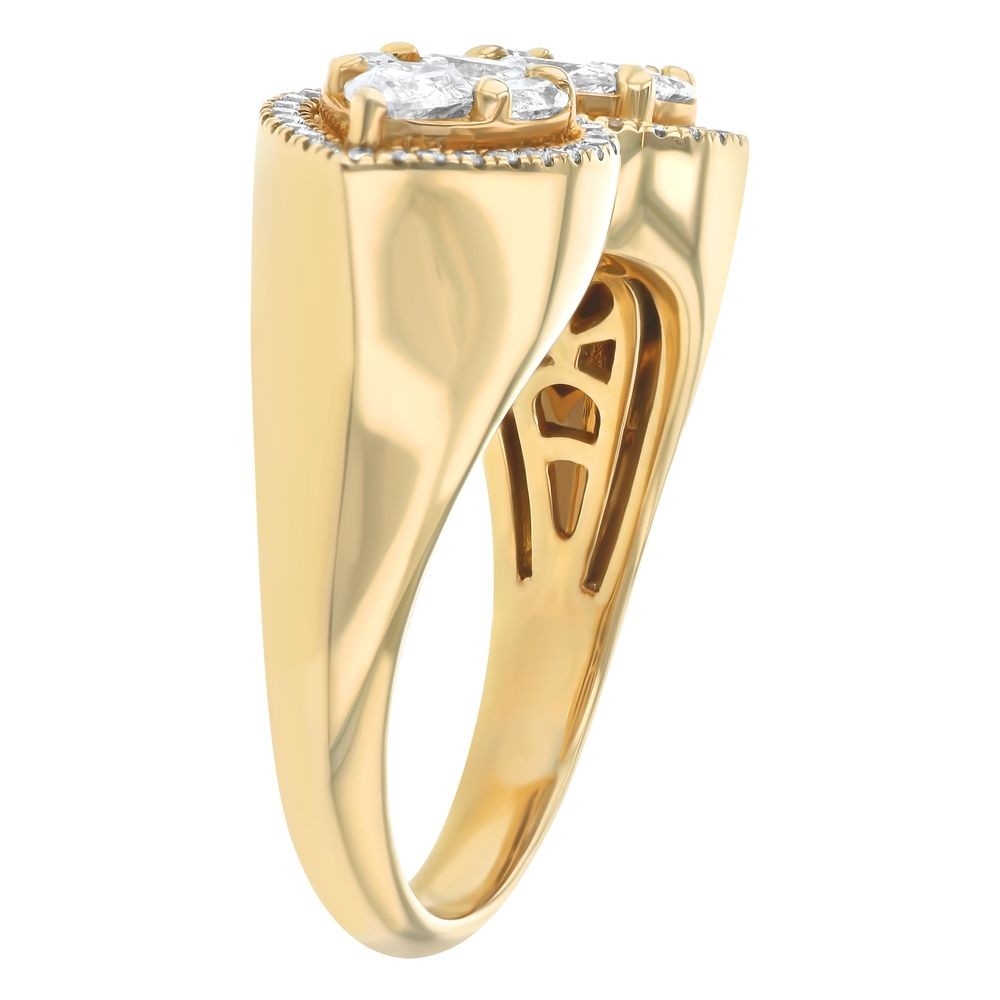 14K yellow gold double pear shape ring set with 1 carat of fancy cut pear, princess, marquise and round brilliant diamonds.