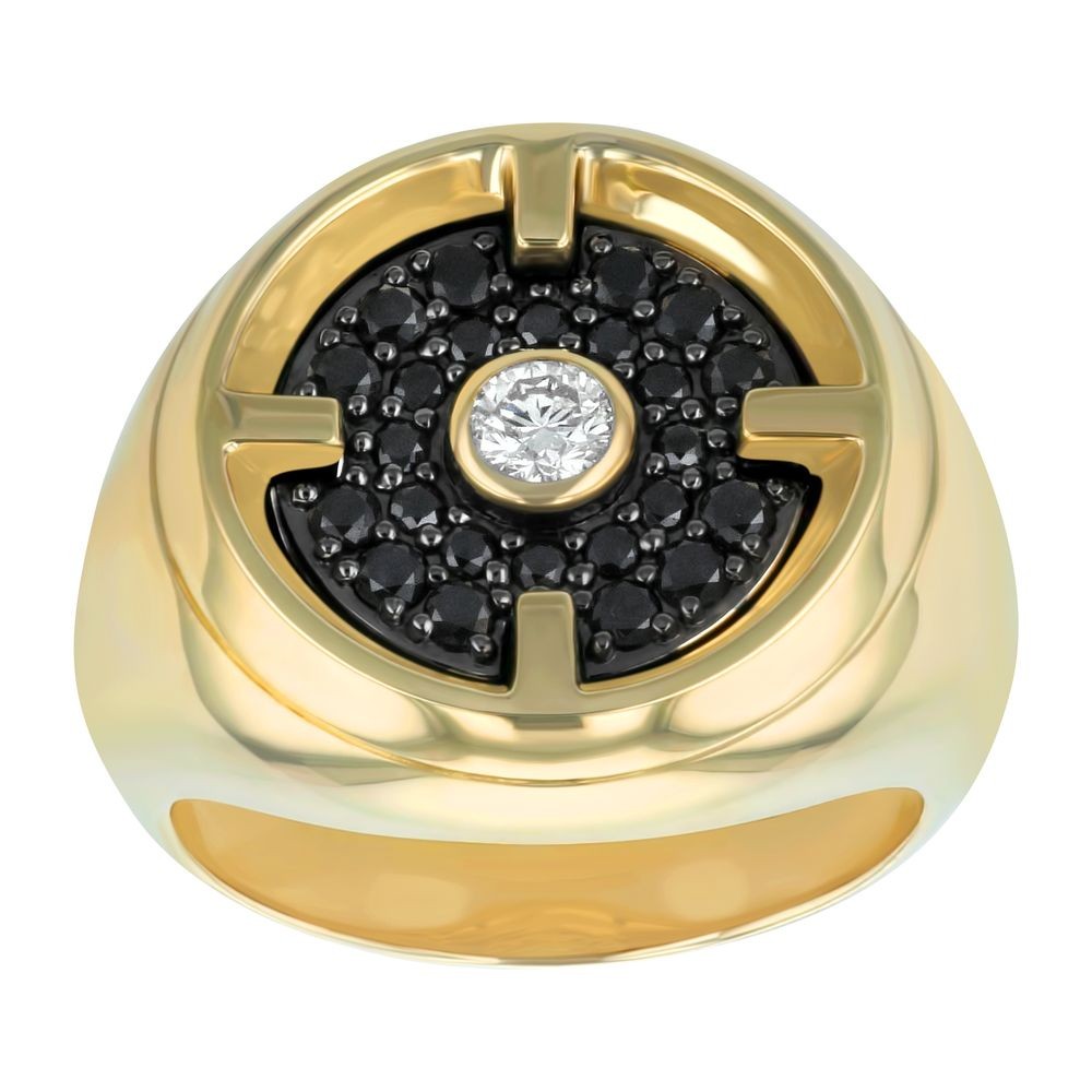 14K yellow gold round shape ring set with 0.25 carat white diamond and 0.75 carat black diamonds in high polish finish and detailed with black rhodium.