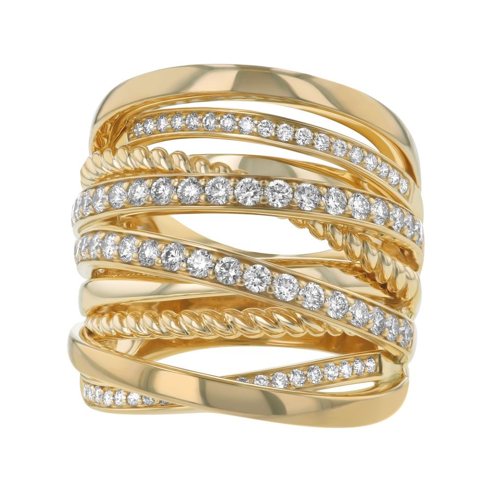 14K yellow gold multi-rows crossover wide ring set with 1.0 ct. white round diamonds and detailed with braided patterns and high polish finish.