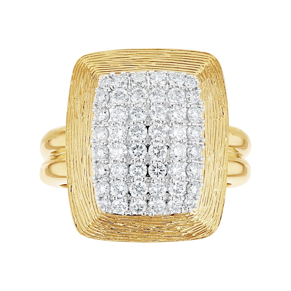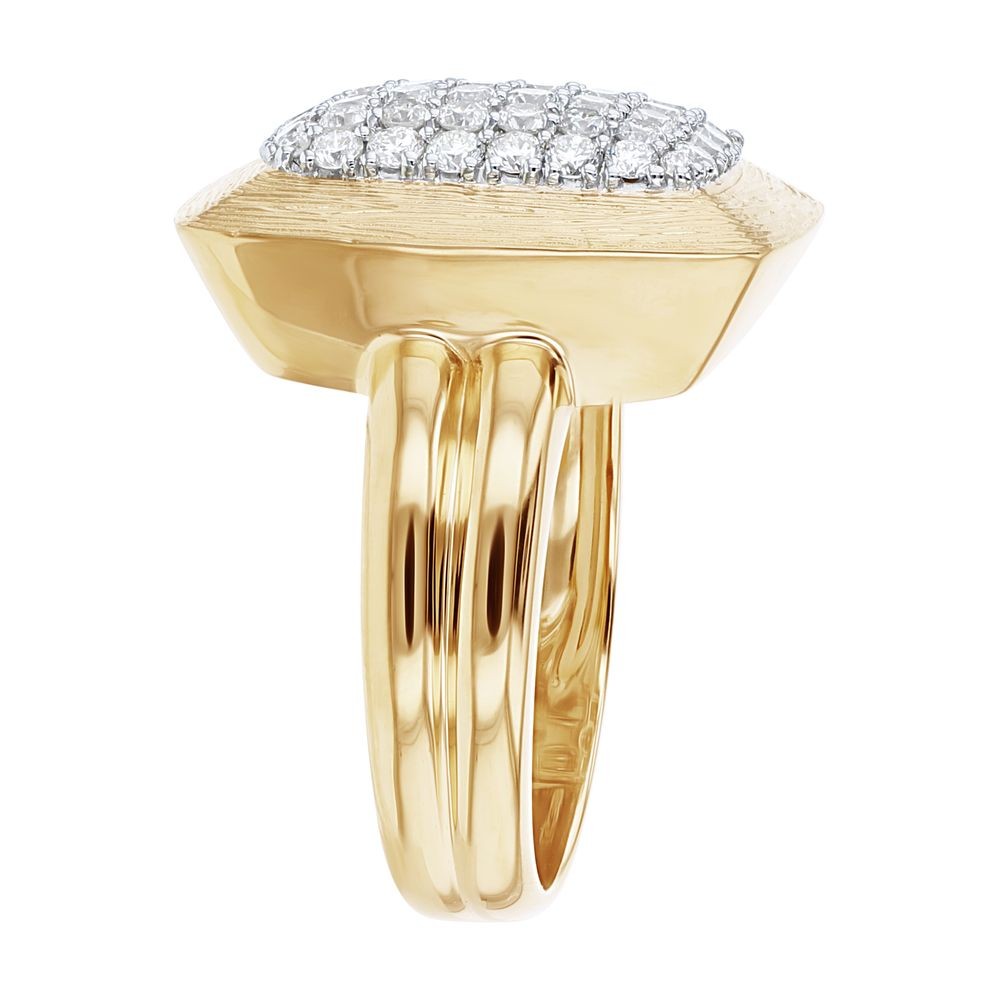 14K yellow gold ring set with 1.0 ct. white round diamonds in rounded rectangular shape and detailed with textured finish.