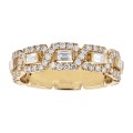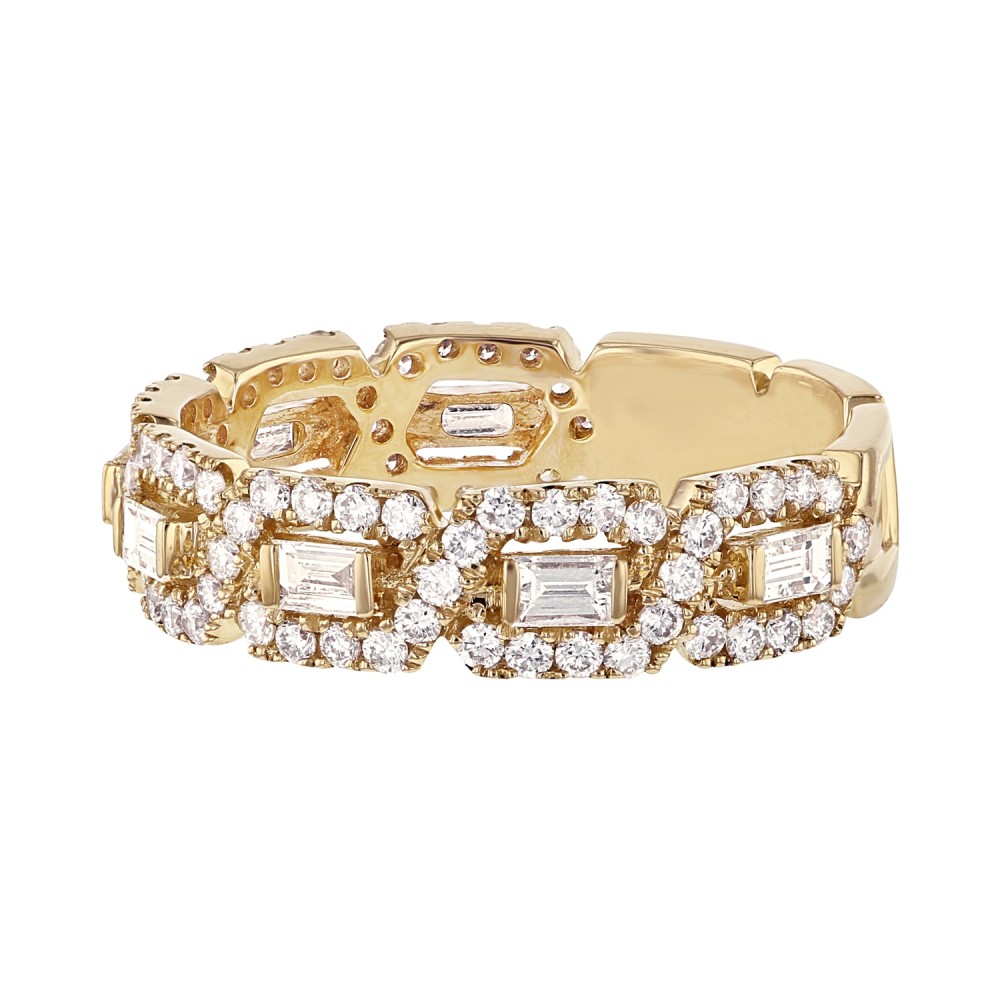 14K yellow gold semi eternity band ring set with 1.00 ct. baguette and round brilliant white diamonds and high polish finish.