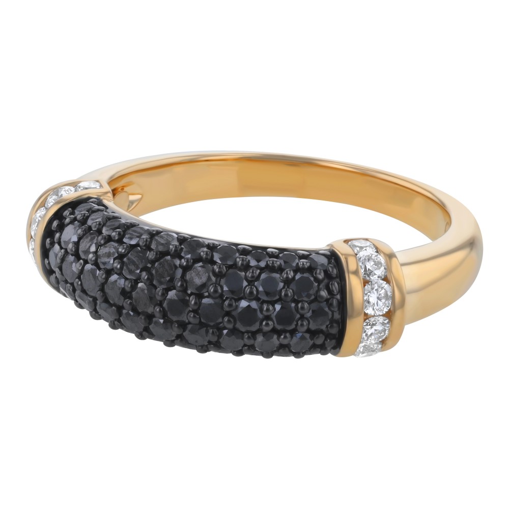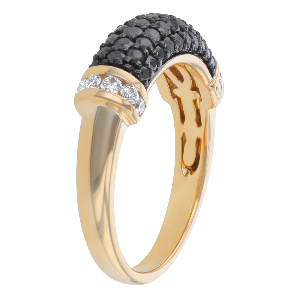 14K yellow gold band ring set with 1.00 carat black and white round brilliant diamonds in dome design.