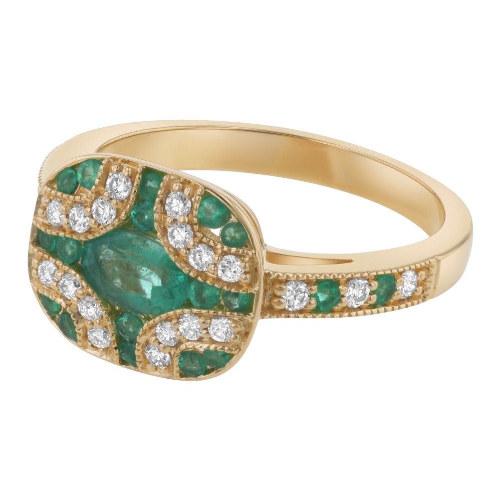 14K yellow gold art deco ring set with 0.25 ct. white round diamonds and 0.75 ct. green emeralds.