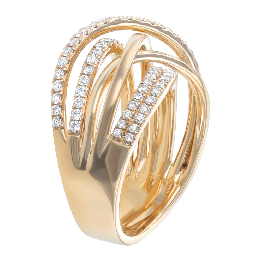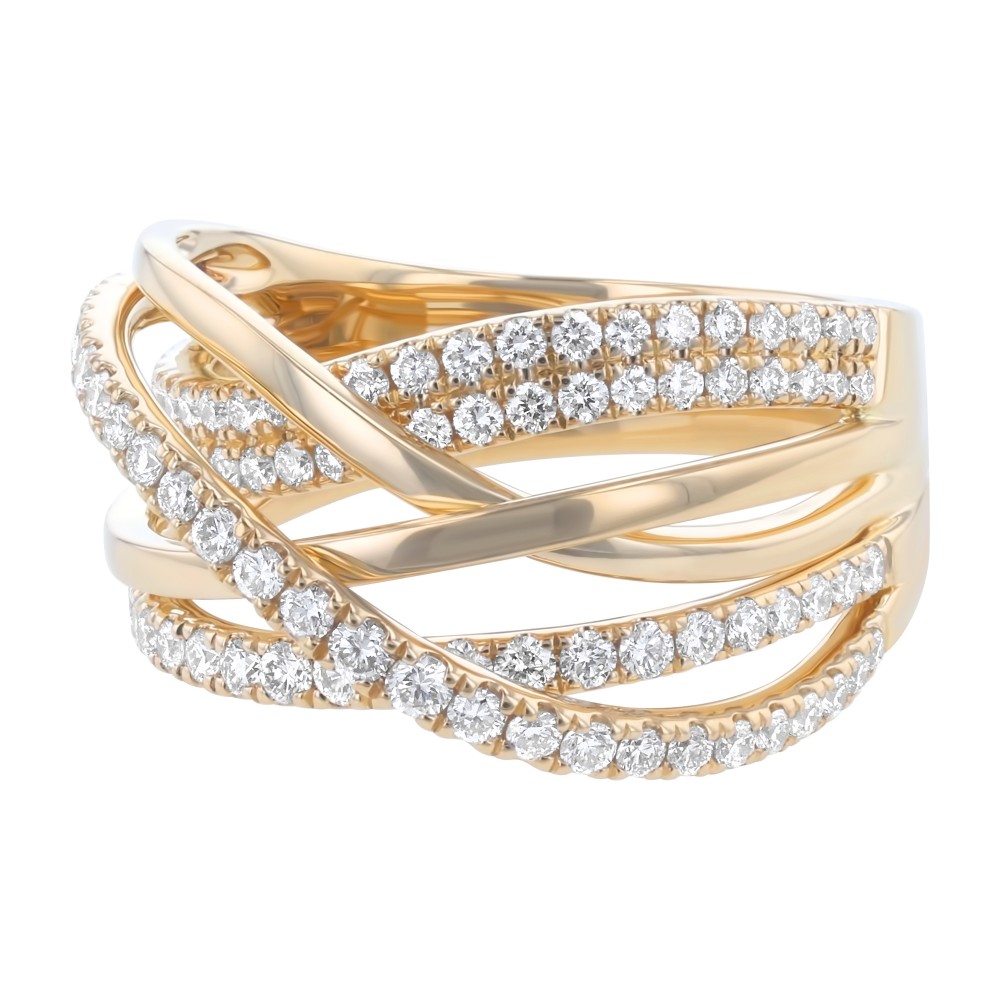 14K yellow gold multi row crossover ring set with 1.00 carat round brilliant diamonds and high polish finish.