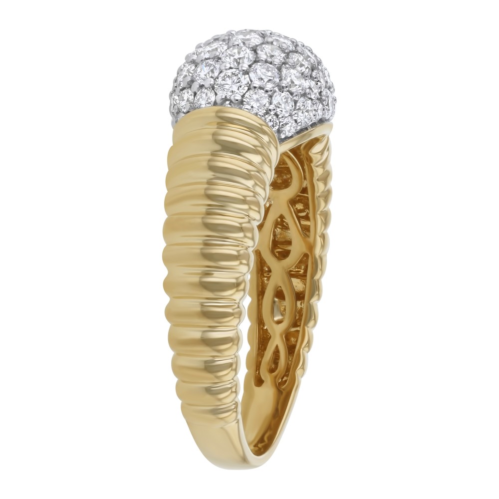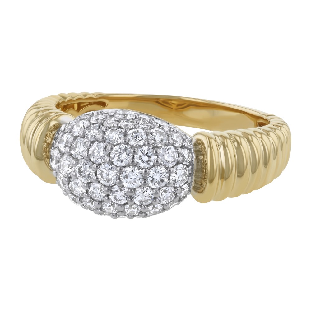 14K yellow gold oval dome shape ring set with 1.00 carat white round diamonds and detailed with braided patterns and high polish finish.