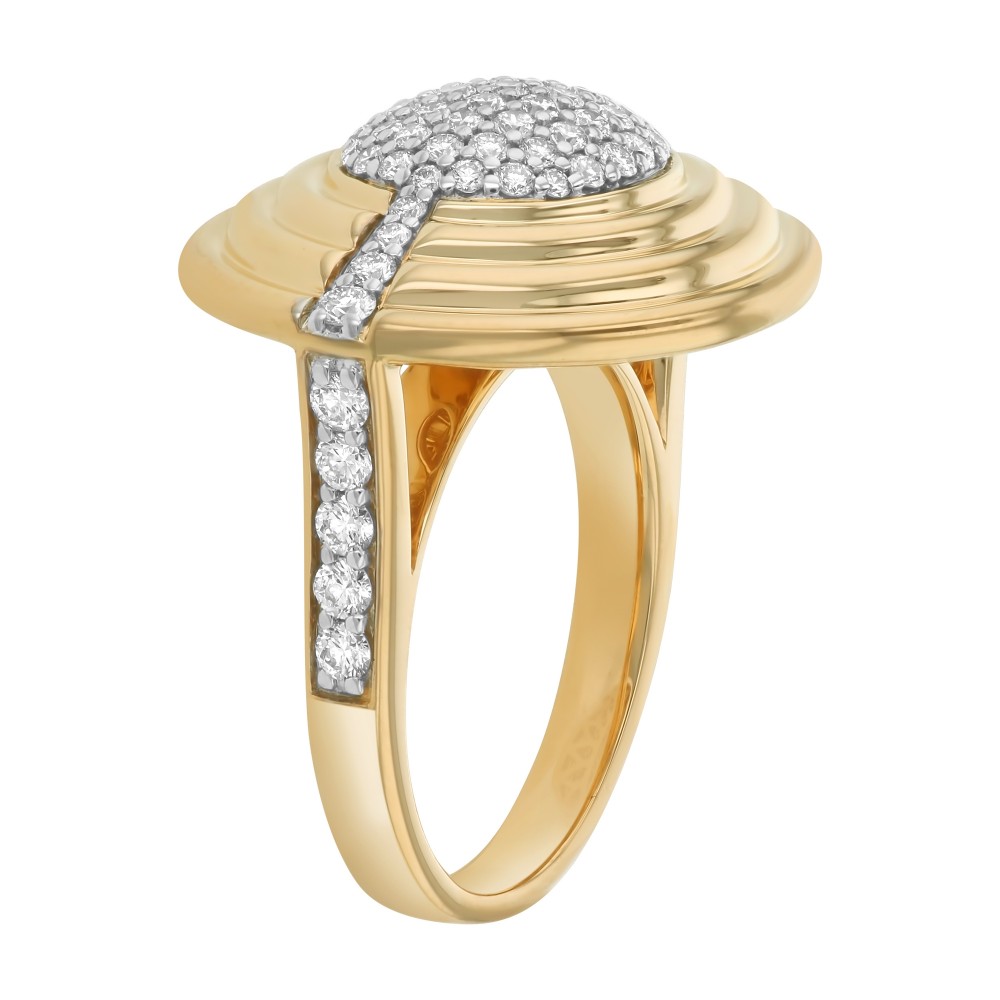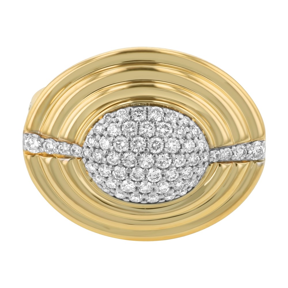 14K yellow gold geometric wide oval statement ring pave set with 1.00 carat round brilliant diamonds and high polish finish.