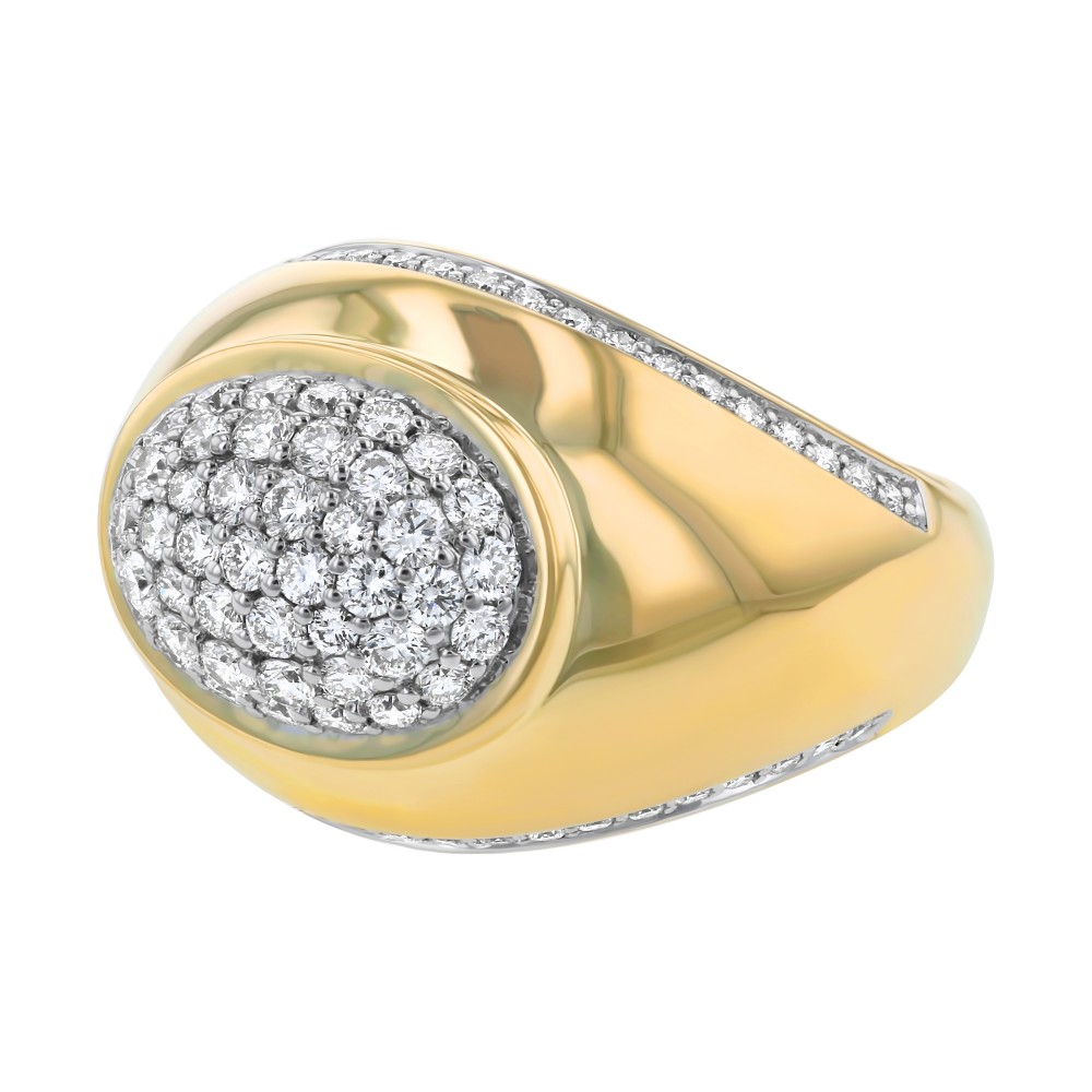 14K yellow gold curved dome ring pave set with 1.00 carat round brilliant diamonds and high polish finish.