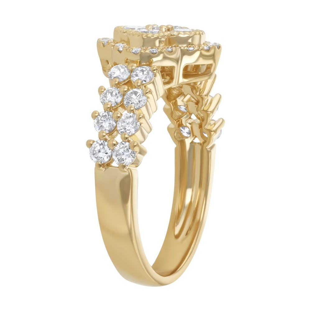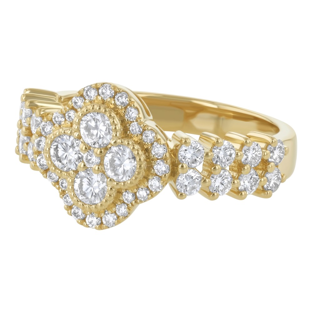 14K yellow gold clover ring set with 1.15 carat round brilliant diamonds and high polish finish.