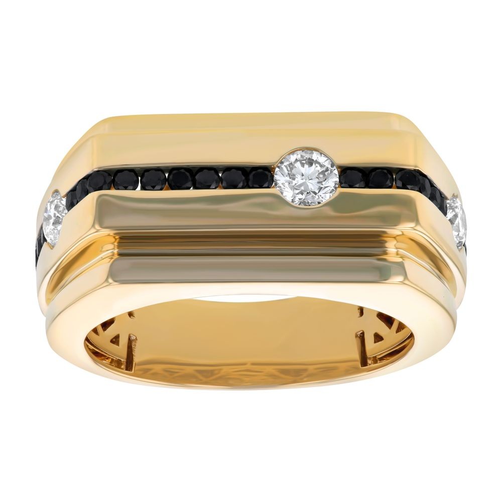 14K yellow gold ring set with 0.75 carat white diamonds and 0.50 carat black diamonds in high polish finish.