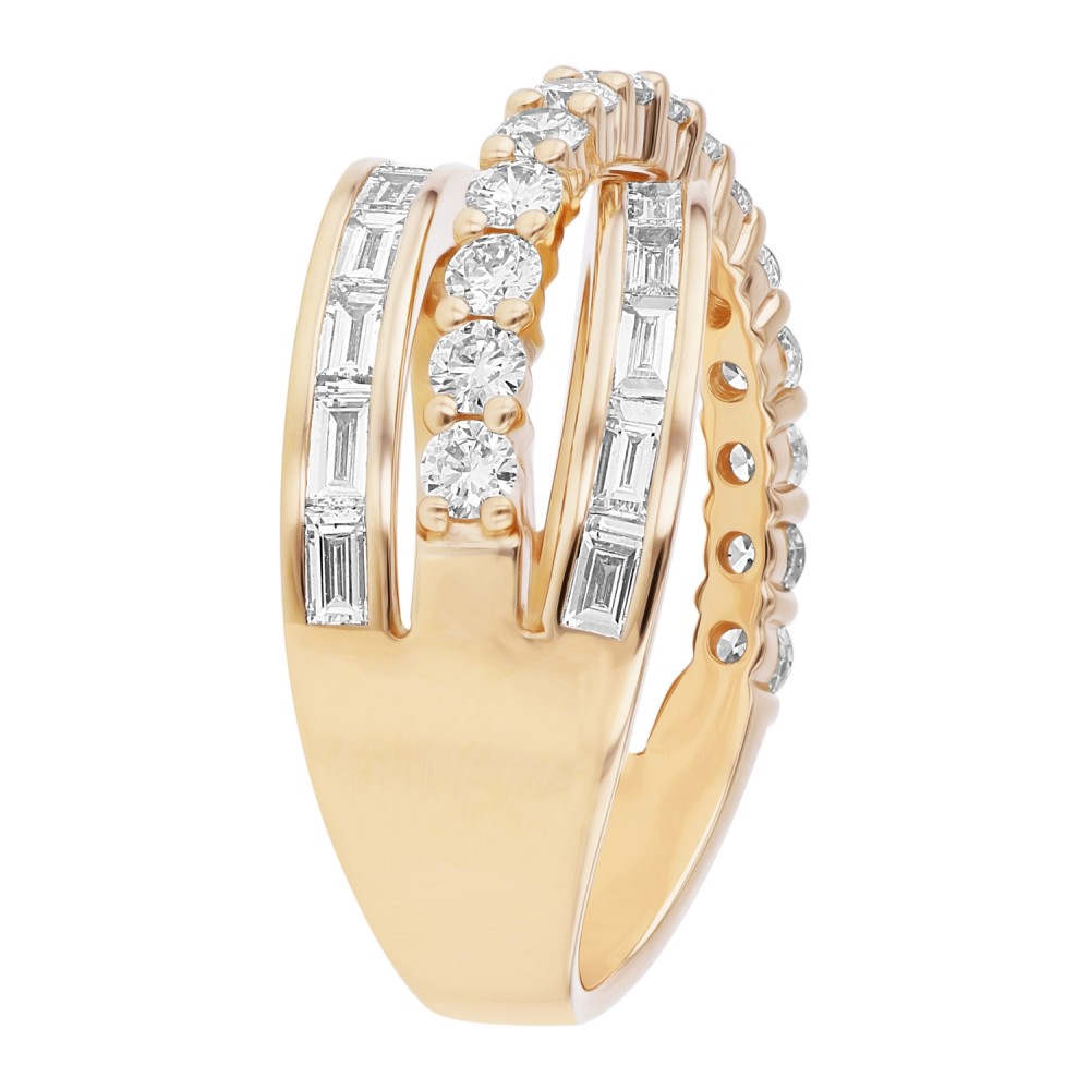14K yellow gold multi row crossover fashion ring set with 1.75 carat baguette and round brilliant diamonds and high polish finish.