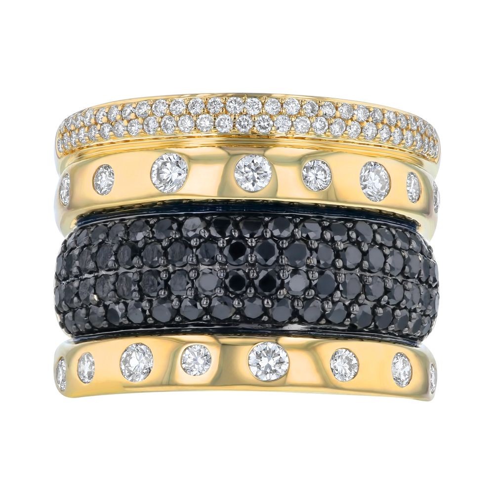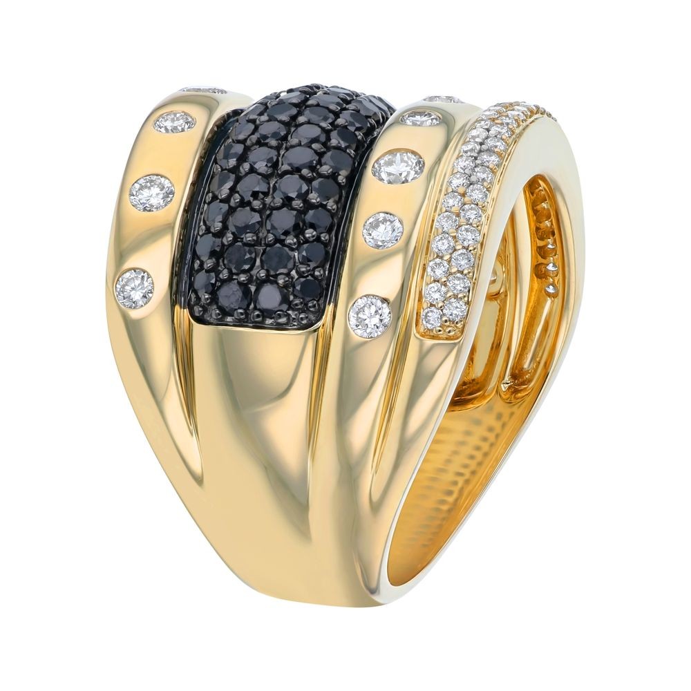 14K yellow gold multi-bands wide ring set with 1.75 ct. black and white round diamonds and detailed with high polish finish.